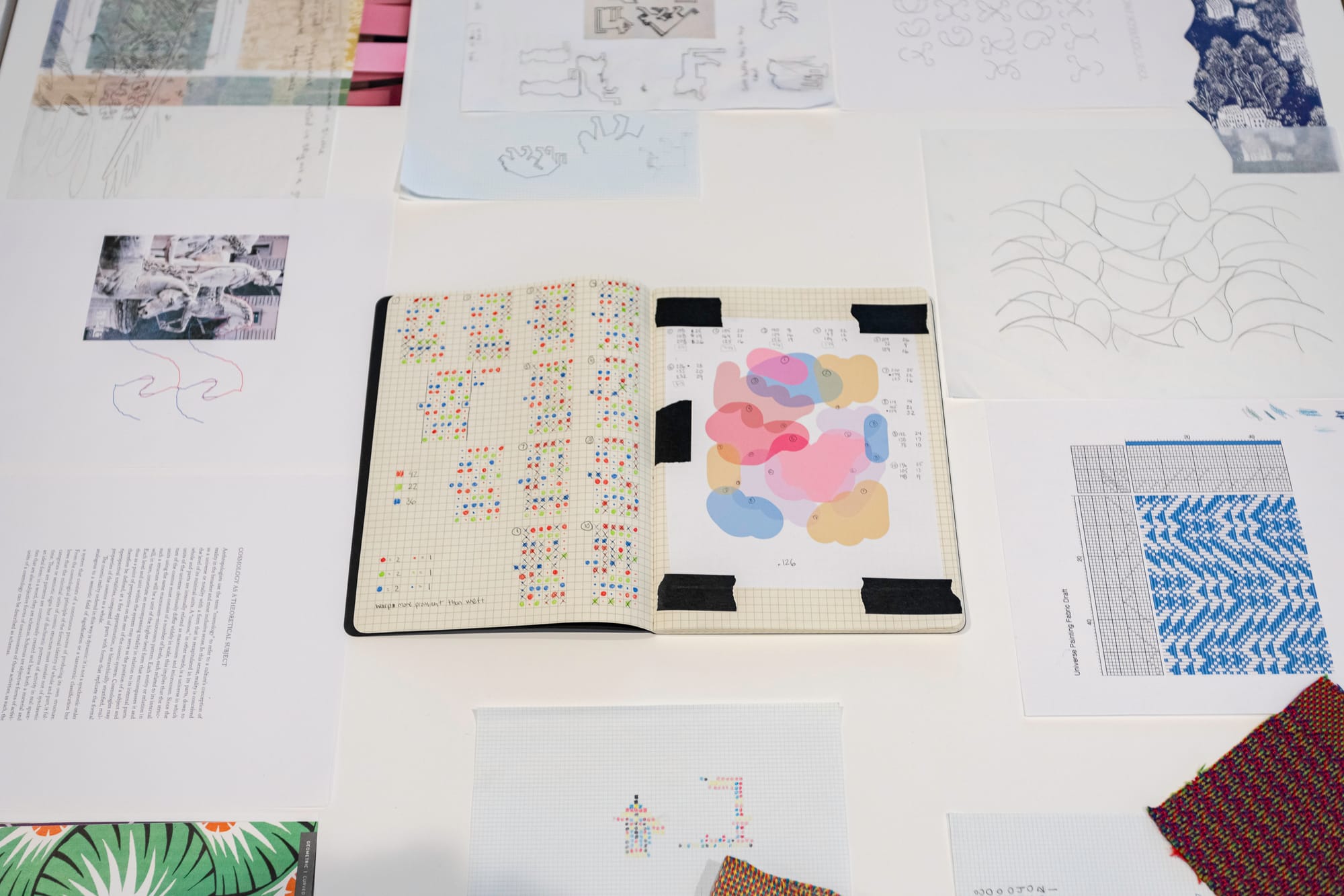 The quality that unites the painting and weaving practices of Barrow Parke is their meticulous attention to detail. A vitrine containing preliminary sketches, notes, and textile samples offers a deeper understanding of the mathematical precision and careful planning behind their work. This process-focused display illustrates the analogy between the creative systems undergirding their work and the larger systems they’re in conversation with: As with the composition of our world, each element is built one strand at a time before being interwoven into a cohesive whole.