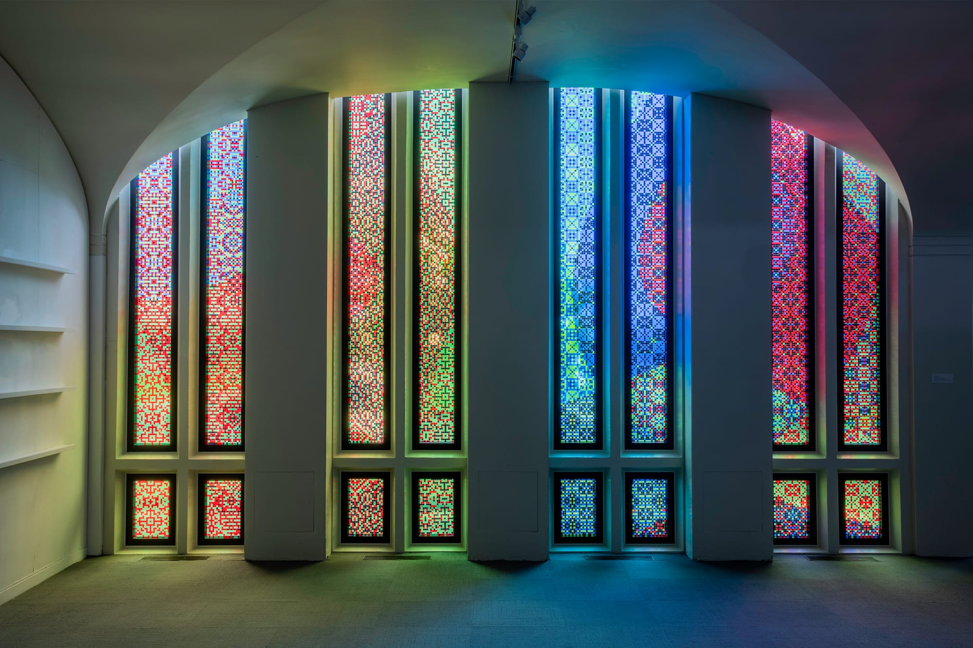 Upon entering the gallery, the viewer immediately encounters a site-specific, floor-to-ceiling, translucent vinyl window installation, “GRB5” (2023). It is simultaneously reminiscent of a church’s stained-glass window, a cross-stitch pattern sampler, and the classic arcade game Space Invaders — a combination of sacred, domestic, and technological image production that recurs throughout the pair’s work. The title references the RGB color space of computer monitors. This recent work represents a development of a long-running interest: Many of the duo’s abstract textile paintings from 2010 to 2015, hung around the outside edge of the gallery, use the same color system or the related CMYK system of commercial printers to create curvy, moire-patterned shapes.