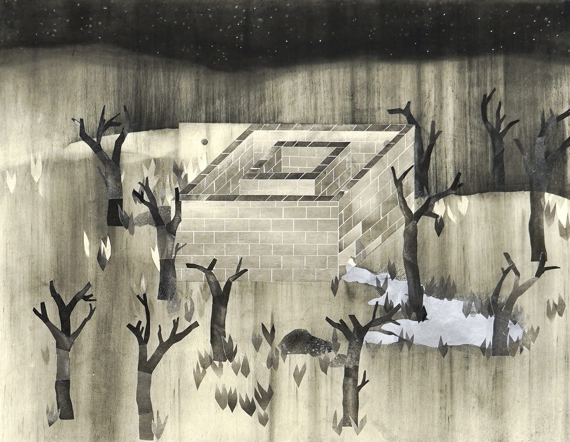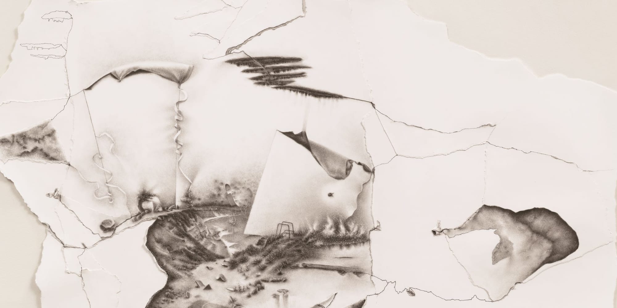 Charlotte Schulz uses her fingertips to blend charcoal vignettes on torn paper, piecing them together to create compositions of surreal spaces grounded by the inclusion of recognizable objects and solitary animals. Schulz’s dreamscapes expose the interconnections of the mind’s eye with one’s surroundings