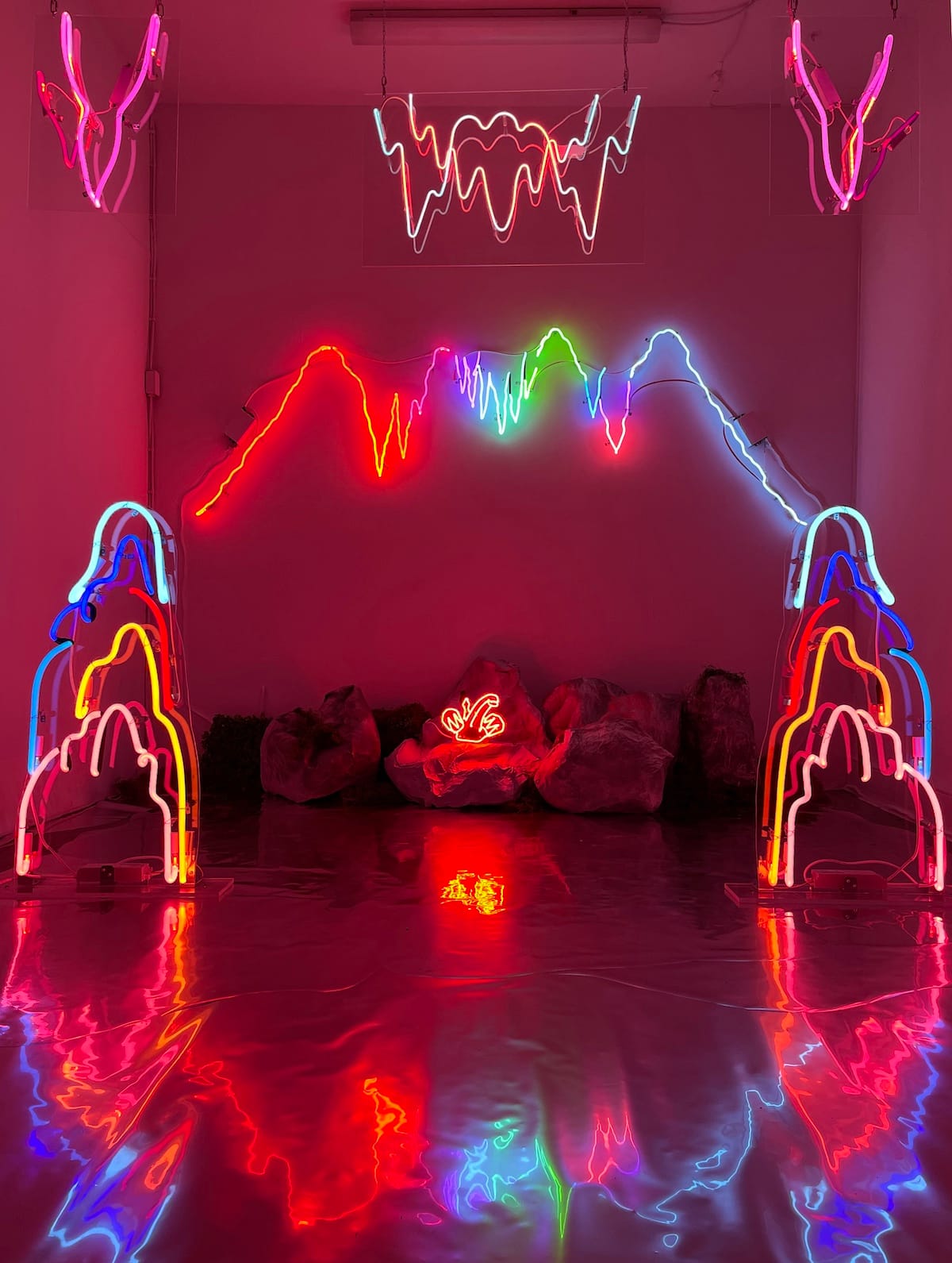 Neon is an unmistakable symbol of 20th-century urban life. With Electric Caverns, Alissa Eberle takes a cue from artists like Dan Flavin, who turned to neon as a medium, and the landscape tradition in art. Eberle’s colorful neon installation combines the human-made and natural worlds to create a surprisingly charming landscape.