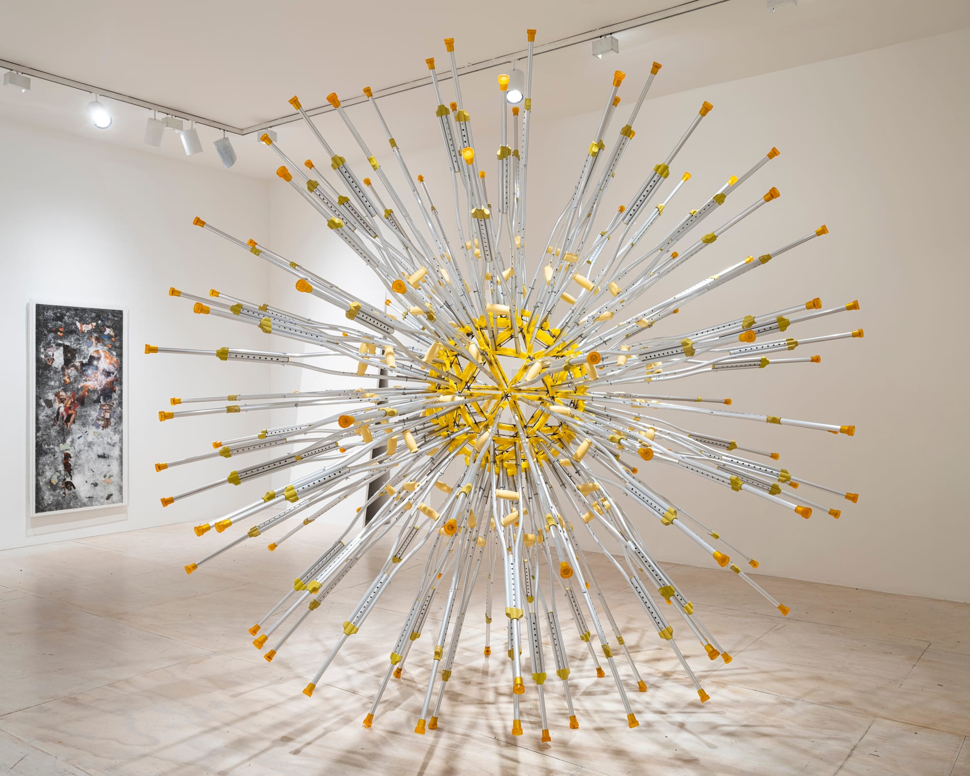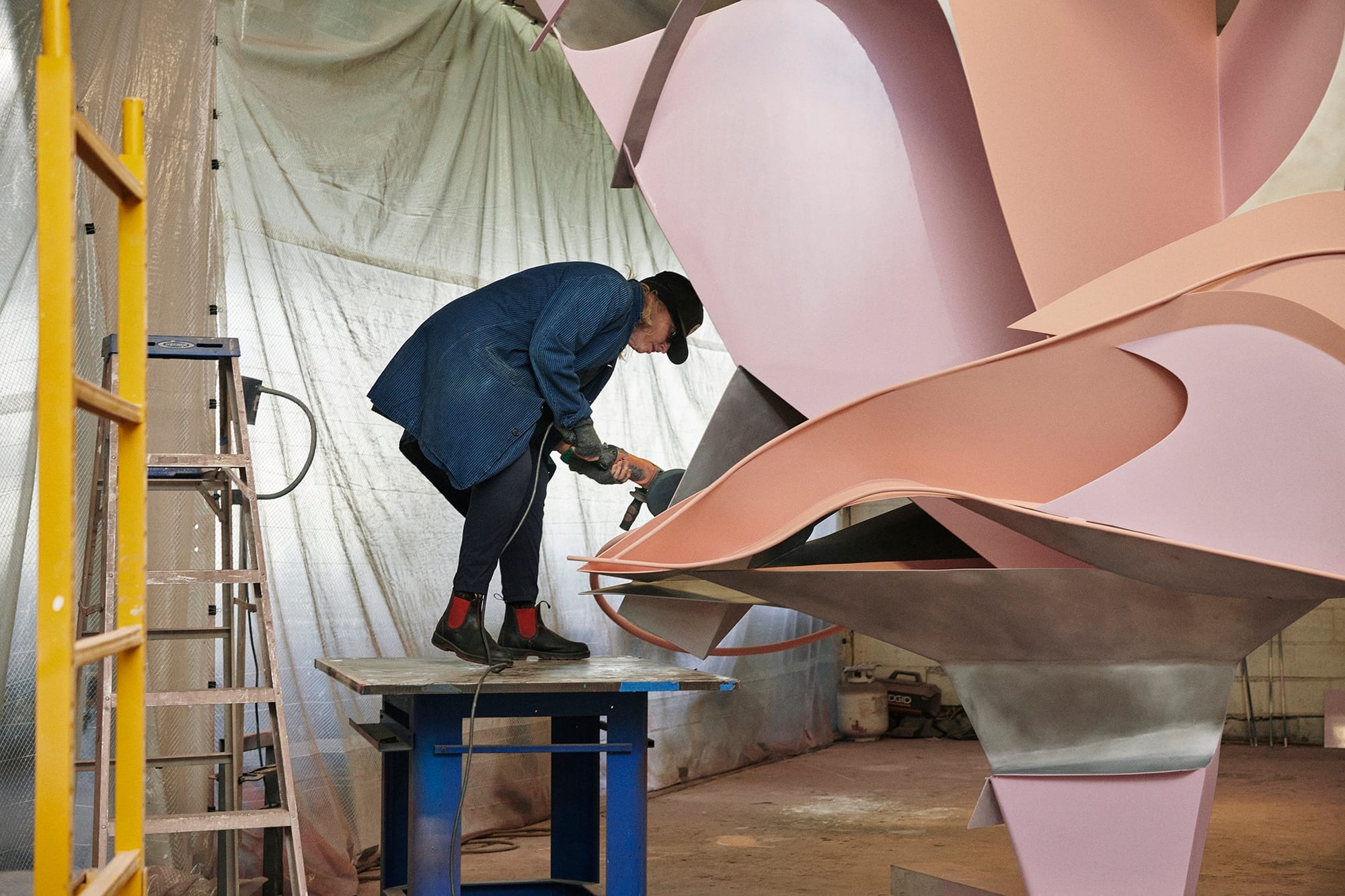 For this exhibition, Arlene Shechet created six large-scale abstract sculptures paired with indoor works made of wood, steel, and ceramic. The vibrantly colored structures mark a new chapter in the artist’s practice as she moves from ceramics to more industrial materials.