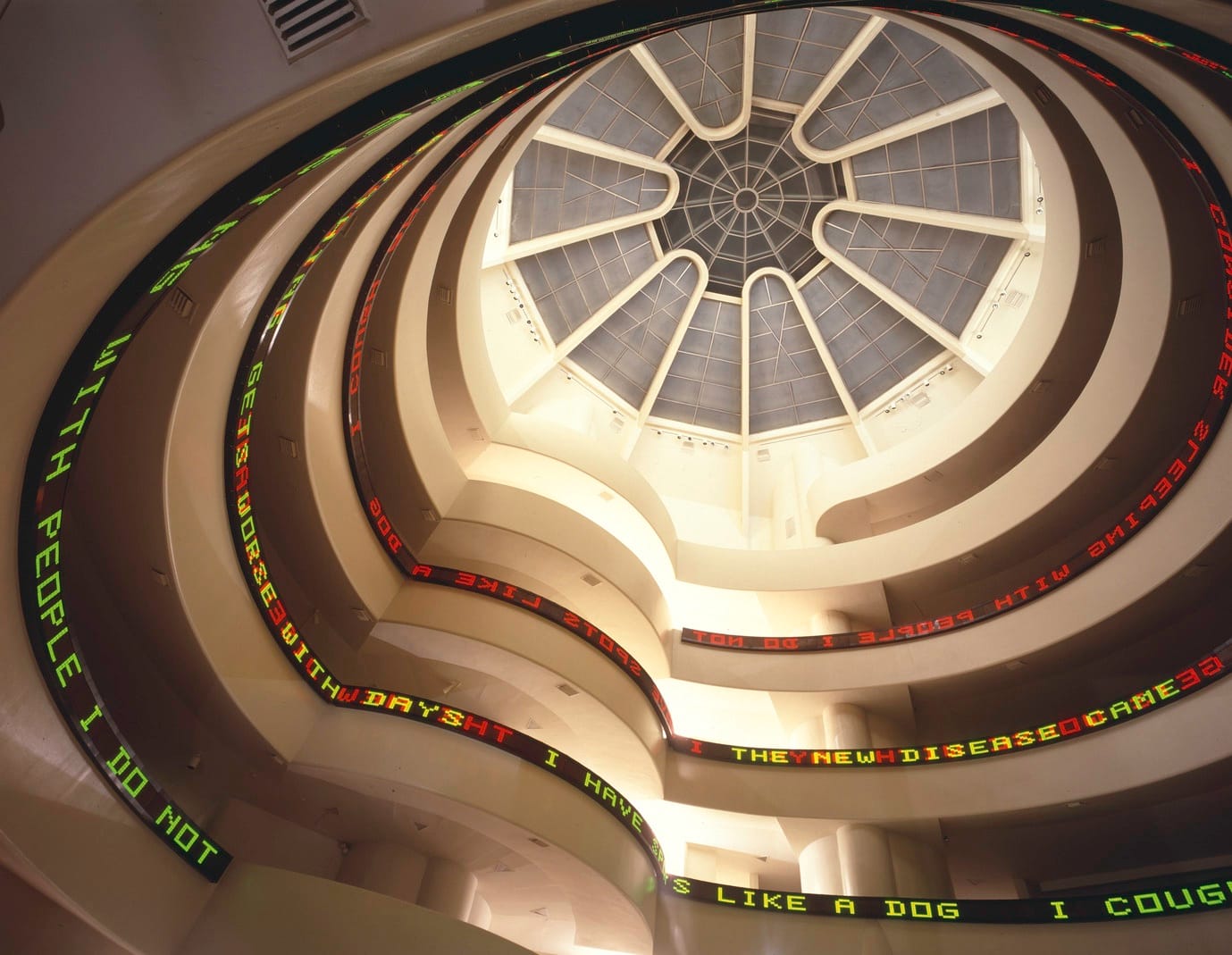 Anchored by an updated expansion of Jenny Holzer’s site-specific 1989 installation at the museum, the Guggenheim presents the artist’s work on a continuous digital text scroll that incorporates some of Holzer’s early lesser-known truisms, along with her recent explorations into AI generative outputs.