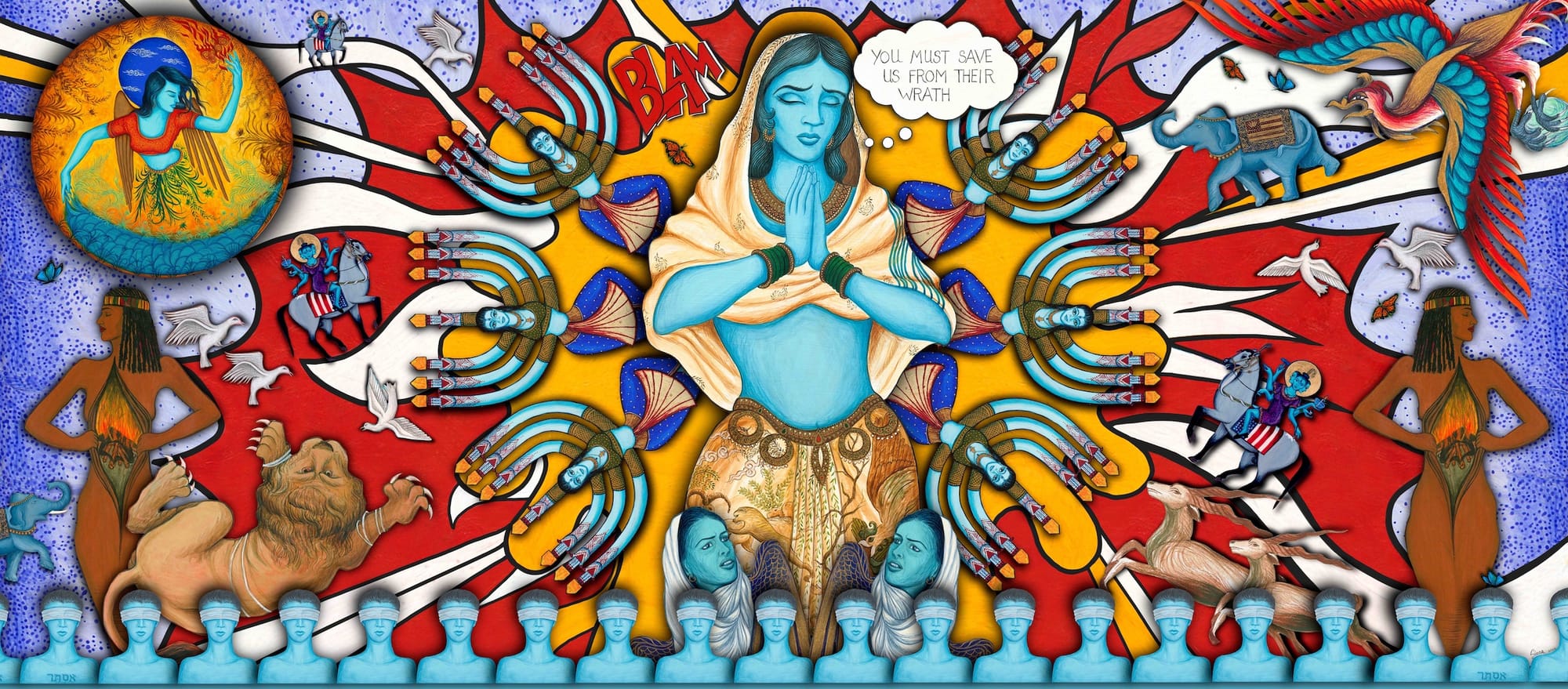 Raised in a historically Jewish community in Mumbai and based in New Jersey, Siona Benjamin’s graphic works blend all three influences. At Montclair Art Museum, the artist created a 30-foot banner that highlights the stories of censured women in Hebrew literature, positioning Lilith, the oft-demonized wife of Adam, as a feminist icon.