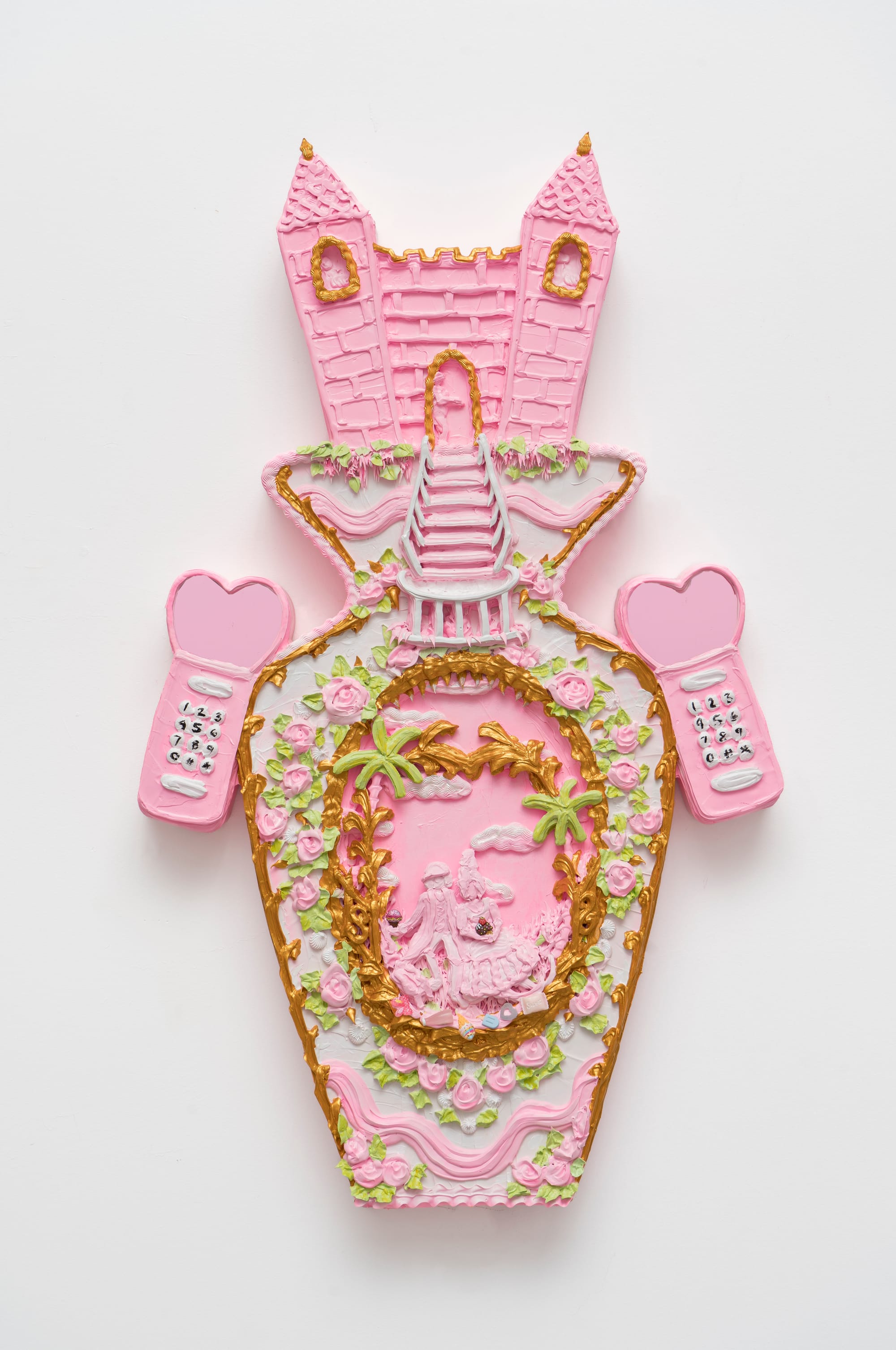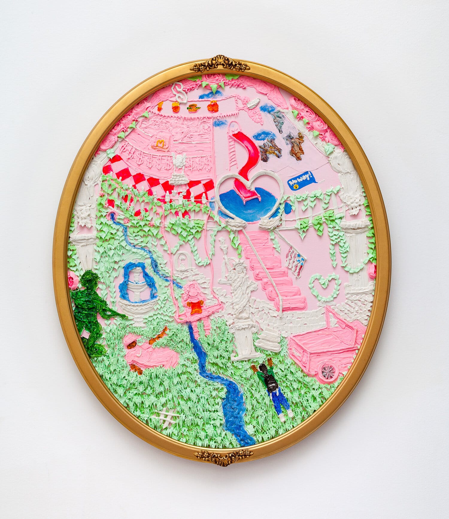 RIDGEFIELD, Conn. — In the center of a gilded frame, a bubblegum-pink relief tells an intricate story: A brown-skinned figure in a Nike sweatsuit reaches for a kid on a swing as an armed toy soldier points his gun. A playground slide that harkens back to the Barbie Dreamhouse from the 1990s leads into an idyllic pool, while an American flag droops from an ornate balcony. In this reinterpretation of Jean-Honoré Fragonard’s canonical painting “The Swing” (c. 1767–68), references to 18th-century European aesthetics hide behind Y2K ephemera and tropes of American consumerism, including McDonald’s meals, emoticons, and the Super S that filled the notebook pages of 2000s kids. A confectionary backdrop of rosettes and foliage almost disguises another figure prostrate before a fading Statue of Liberty, alluding to the specter of immigration enforcement that infects the otherwise candied dreamscape.