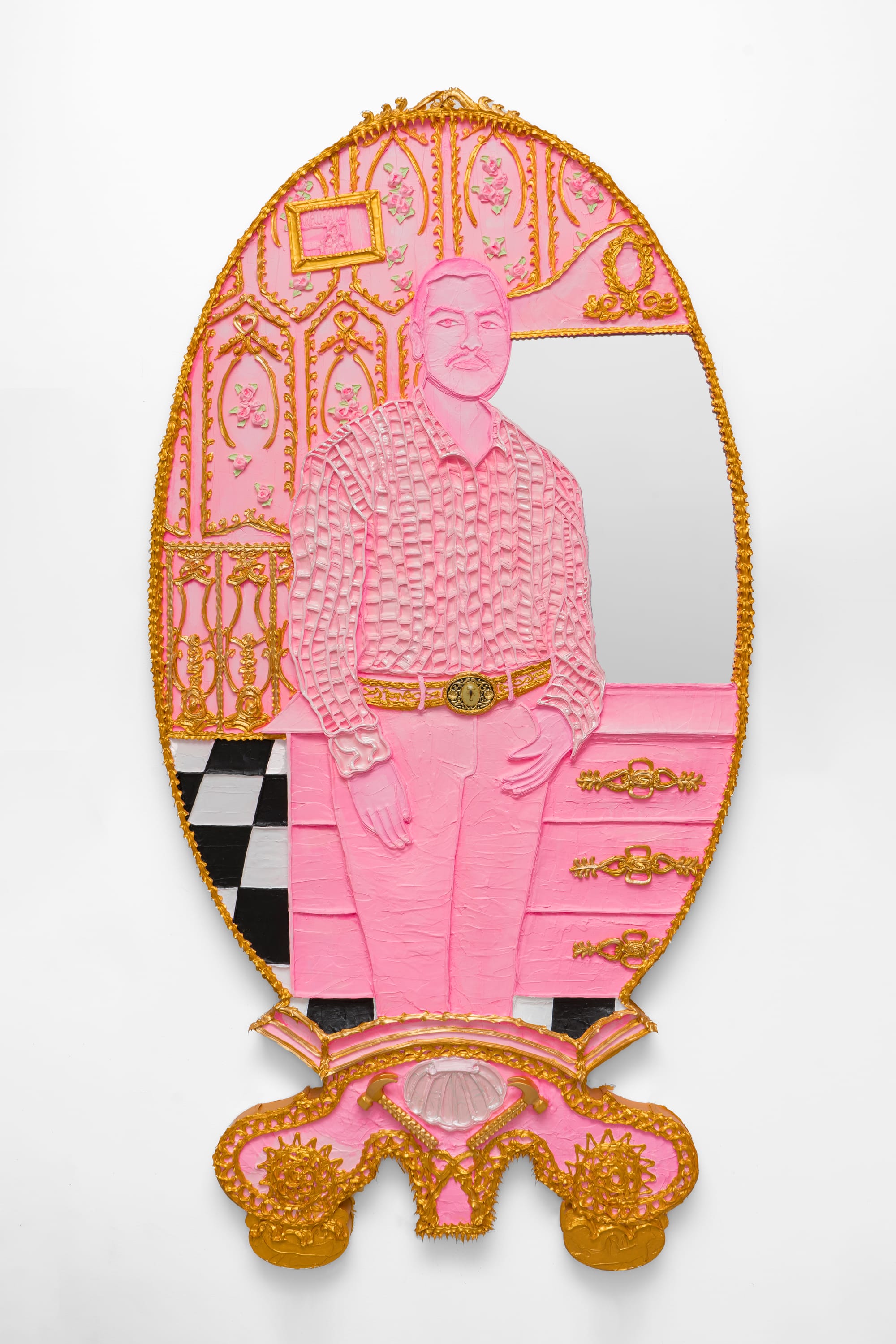 Mayorga again reinterprets European classical art in her series American Urn (2019–ongoing), which culls imagery from Churrigueresque-style Catholic churches in Mexico. The paintings are replete with Rococo-inspired trimmings, scrollwork, and religious imagery, pointing to the colonial underpinnings of Western art history. One of the most memorable pieces in the exhibition is “El Castillo de Oro” (2023), an urn with a castle-like facade bedecked in nostalgic relics, including a flip phone and Hello Kitty, the ultra-femme mascot of Mayorga’s work. Pedestalized in a small pink room lined with checkerboard floors reminiscent of Versailles, Mayorga reimagines the violence of religious colonialism by situating it in her childhood fairytale.