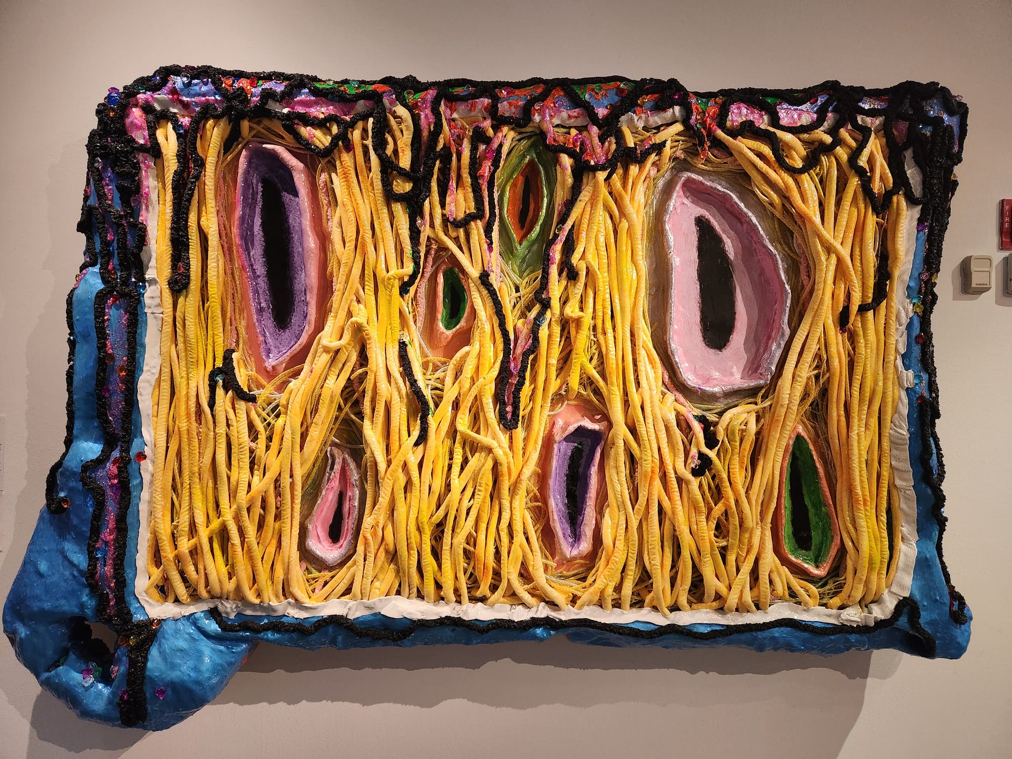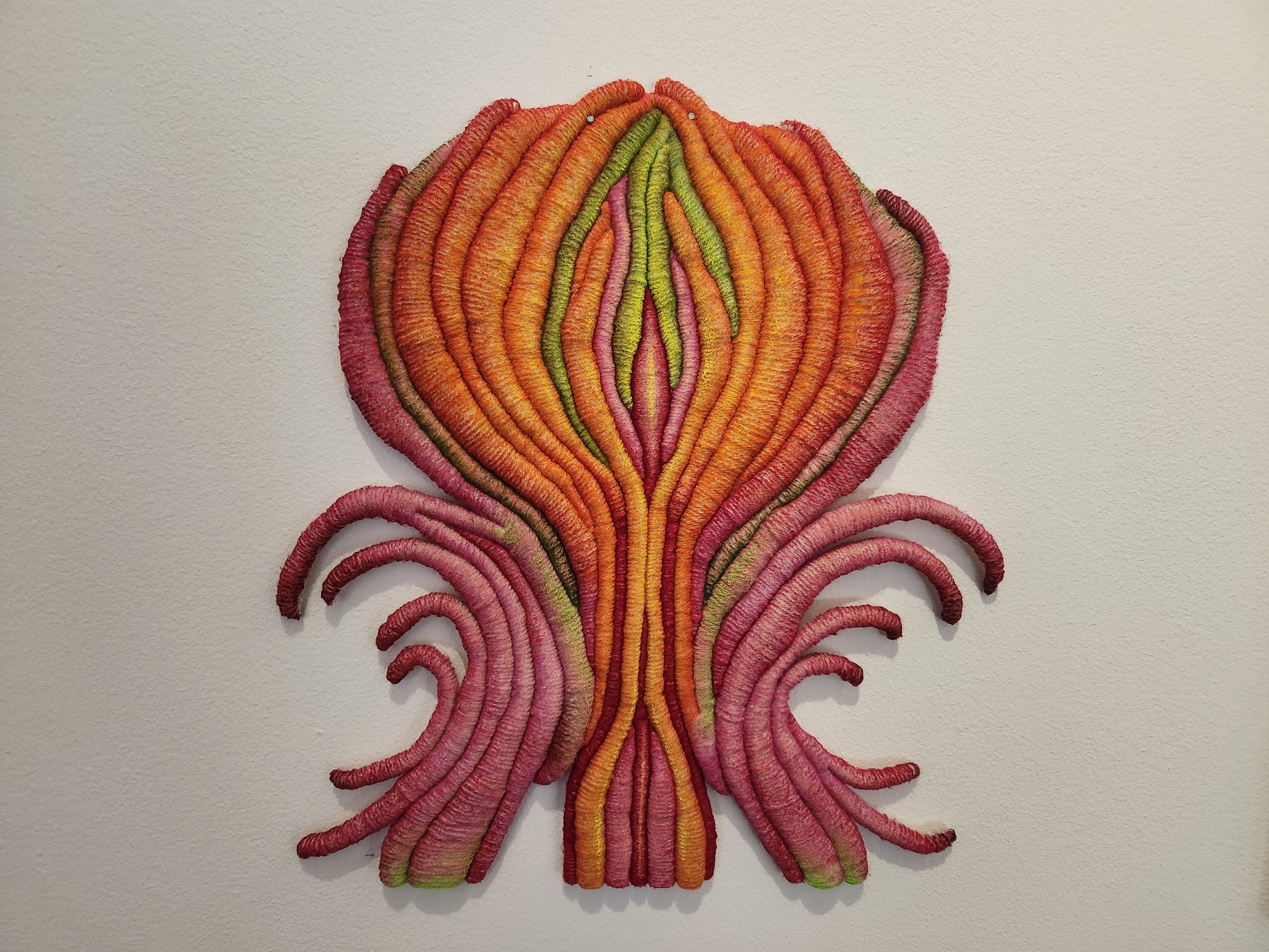 Korean artist Ami Park's three meticulous fiber works, informed by her attempts to decode the universe through science and spirituality, are complemented by the vibrancy of Judy Giera's enormous sculptural painting, which celebrates the experiences and joy of trans womanhood, displayed on the opposite side of the same wall.