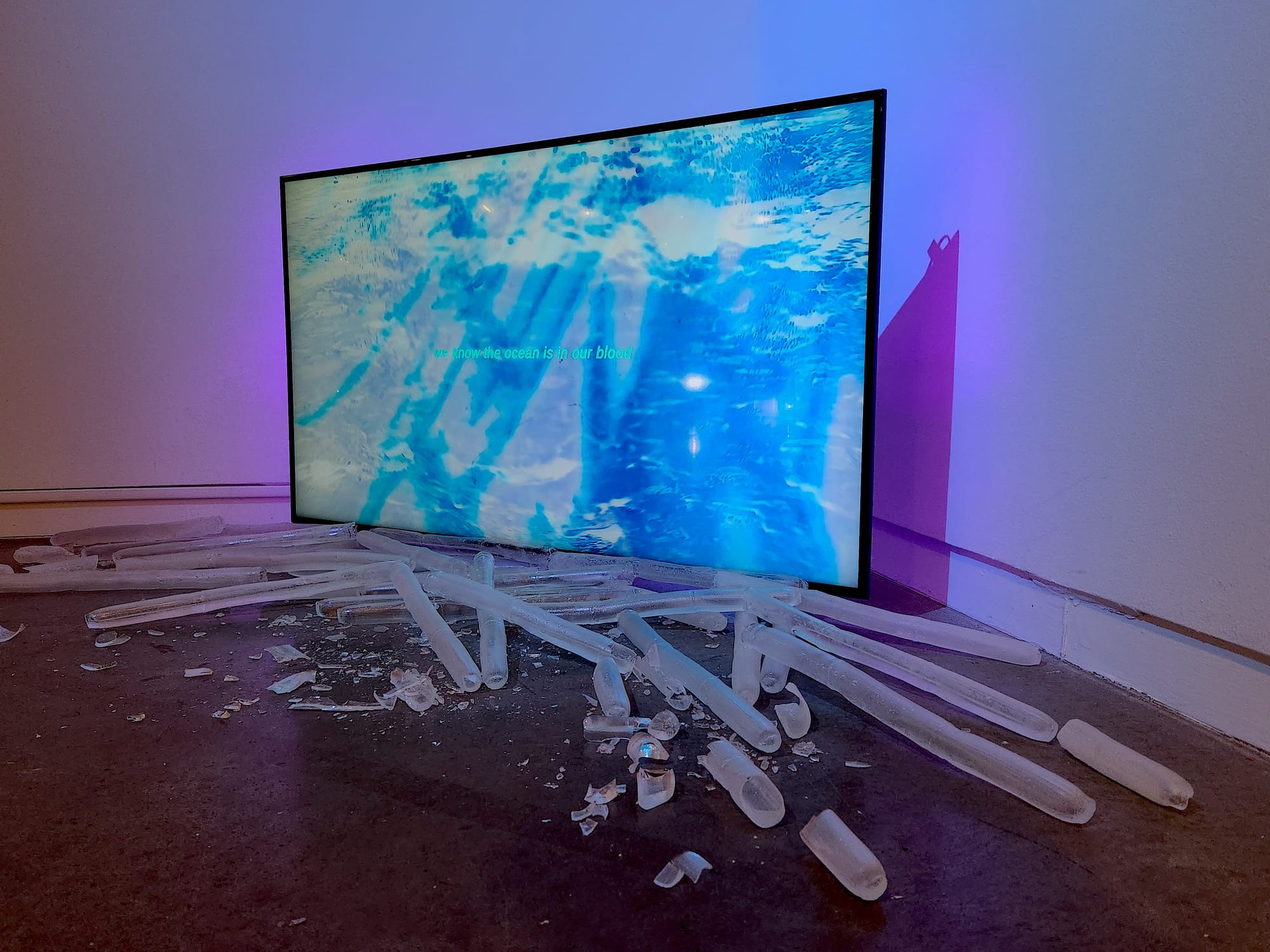 On opposite ends of the gallery, Maya Jeffereis and Fred Schmidt-Arenales, alongside collaborator Maia Chao, delve into various histories through video installation works sourced from archival materials. Situated on the floor, Jeffereis's "Passages II" (2024) explores Fijian anthropologist Epeli Hau'ofa's characterization of Oceania as connected and strengthened as a "sea of islands"; the inspiration is the artist's ancestral history of Japanese indentured laborers working in the sugarcane plantations of Hawai'i.