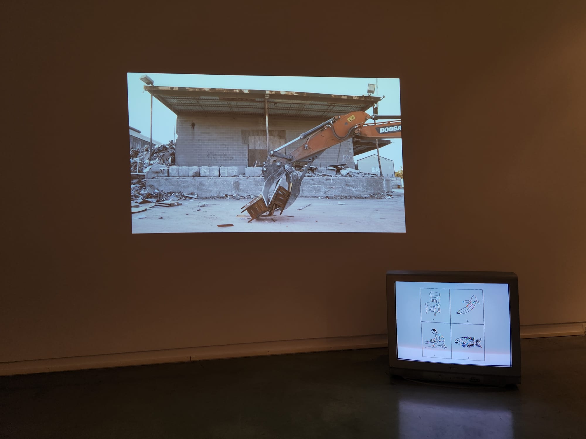 "We ended up being more drawn in by the artifacts that point to the behavioral control and conditioning that this system requires — the textual and televisual materials we found in the trash," he continued, referencing the two-channel presentation of demolition clips and scripted scenes juxtaposed with old advertisements and guides for products of the past. "The 'neo-liberal vision of the good life' has to be codified and transmitted via various forms of media before people will participate."