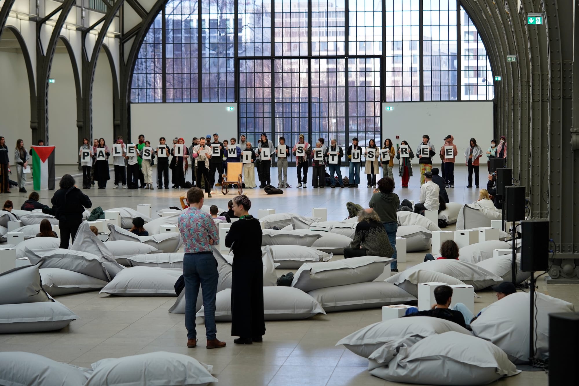 Videos posted to social media by the art activist group Thawra (Arabic for “revolution”) and Palästina Spricht (German for “Palestine Speaks”) showed roughly three dozen demonstrators forming a single line, holding up Palestinian flags and solidarity signs, and verbally sparring with museum staff and Bruguera, chanting “Shame on you! Shame on you!” during one of the interventions. At one point, Bruguera confronted protesters, asking them, “Do you have a gun? Are you going to kill me?” to which they vocally denied any violent intention. Later, on social media, some commenters characterized the questions Bruguera directed to the activists as a “racial attack.”