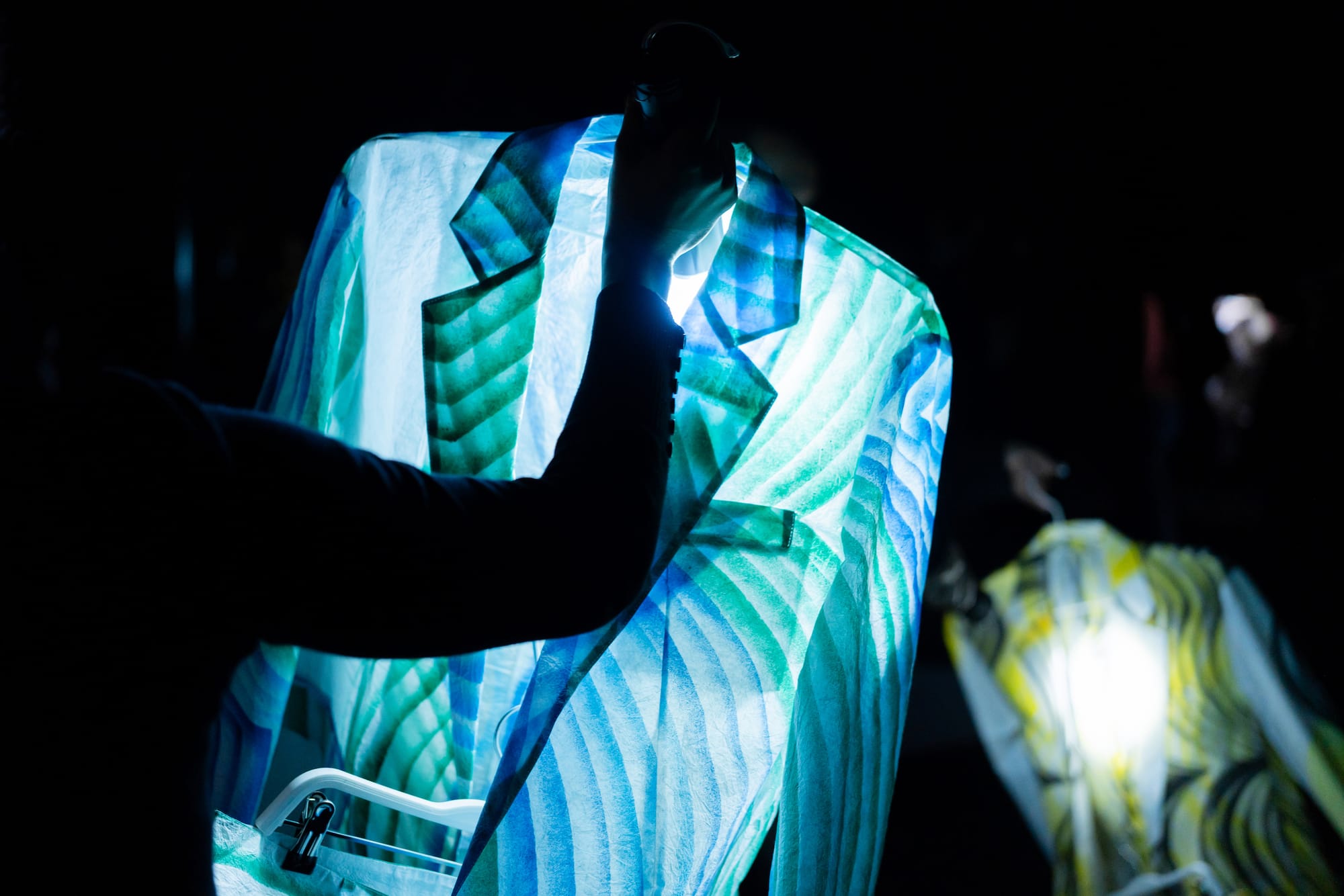 MEXICO CITY — In the beginning, there was darkness. So unfurled Carlos Amorales’s performance Fragmented States, which brought together a dizzying host of singers, dancers, and percussionists to compose an alternate creation story. On February 7, on the occasion of the 10th anniversary of Mexico City’s Feria Material, visitors streamed into the cavernous main hall of the Polyforum Cultural Siqueiros, the space illuminated only by narrow beams of light that emanated from performers’ pocket flashlights. Crouched around metal clothing racks holding white paper suits intricately airbrushed with colored stripes, performers used the light to trace the garments’ contours, leaving the auditorium and audience in the dark.