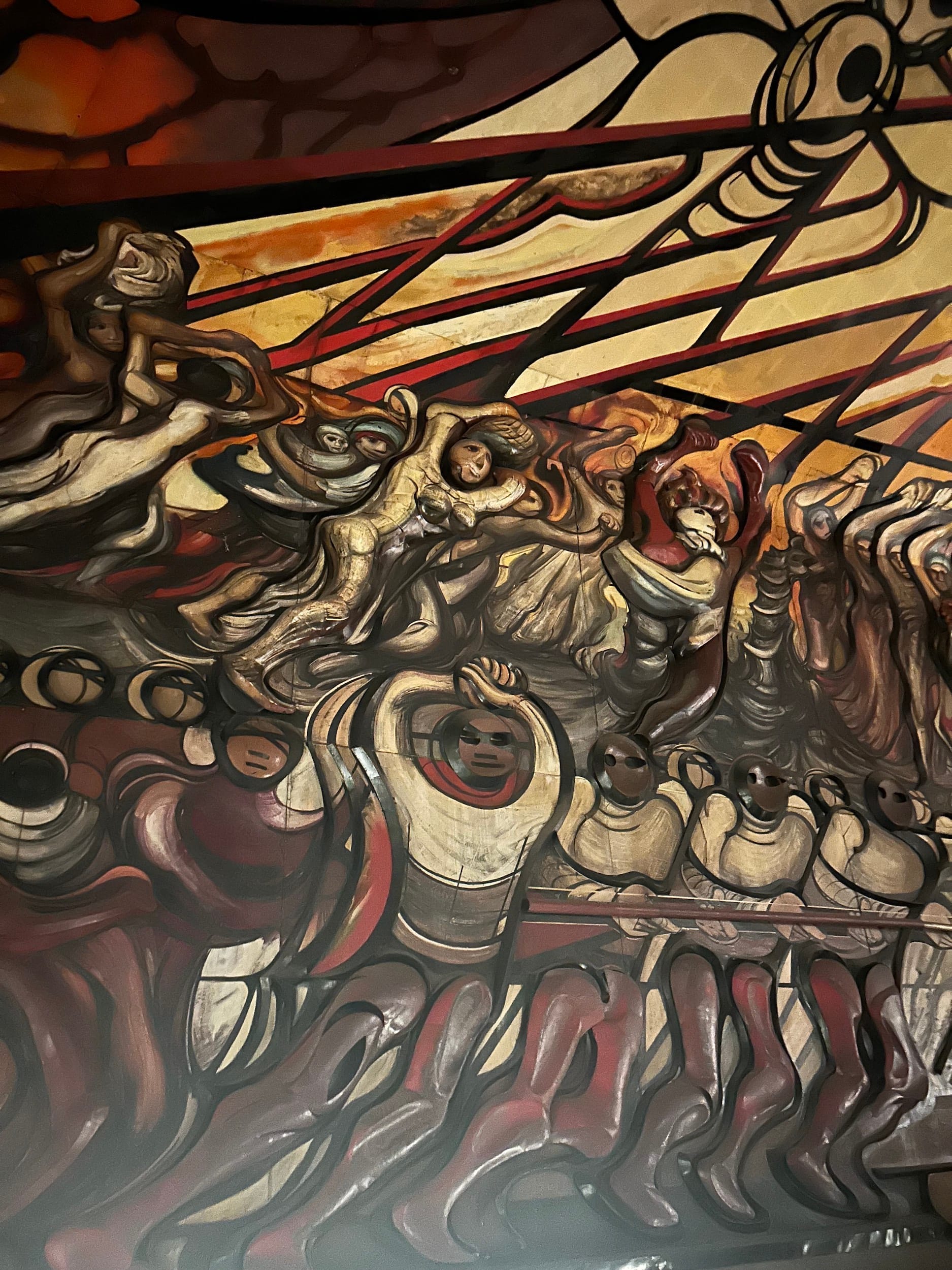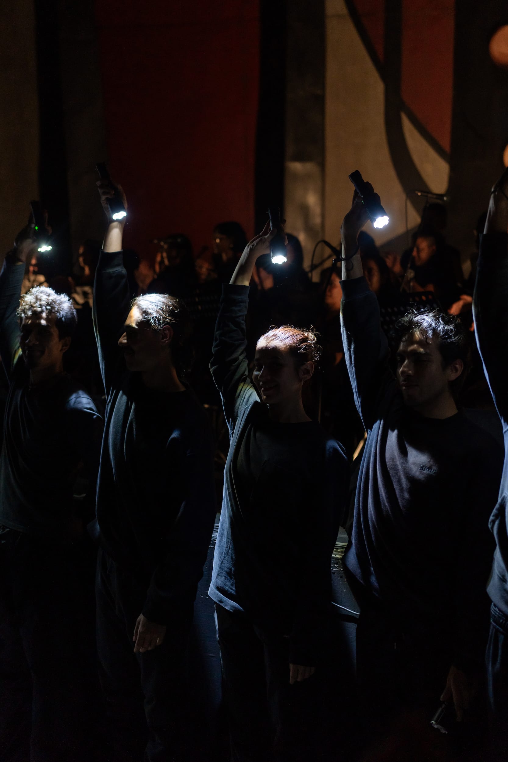 Silence slipped into cacophony as various singers around the perimeter of the hall launched into piercing shrieks and calls, layered over the more traditional harmonies of a choral ensemble. The resulting sonic landscape, at once harsh and grandiose in its otherworldliness, evoked that of a new order clawing into existence. Flashlights turned toward the singers cast the performers’ long shadows across the whorls of David Alfaro Siqueiros’s iconic murals.