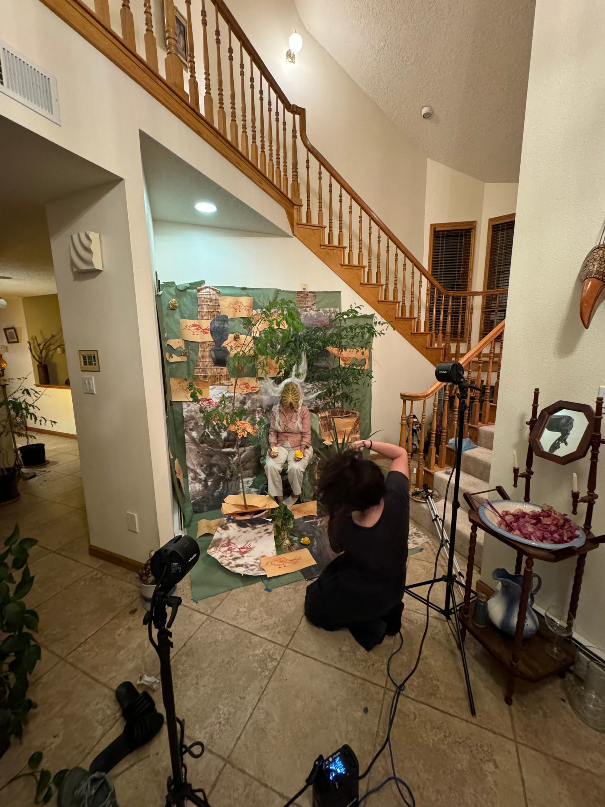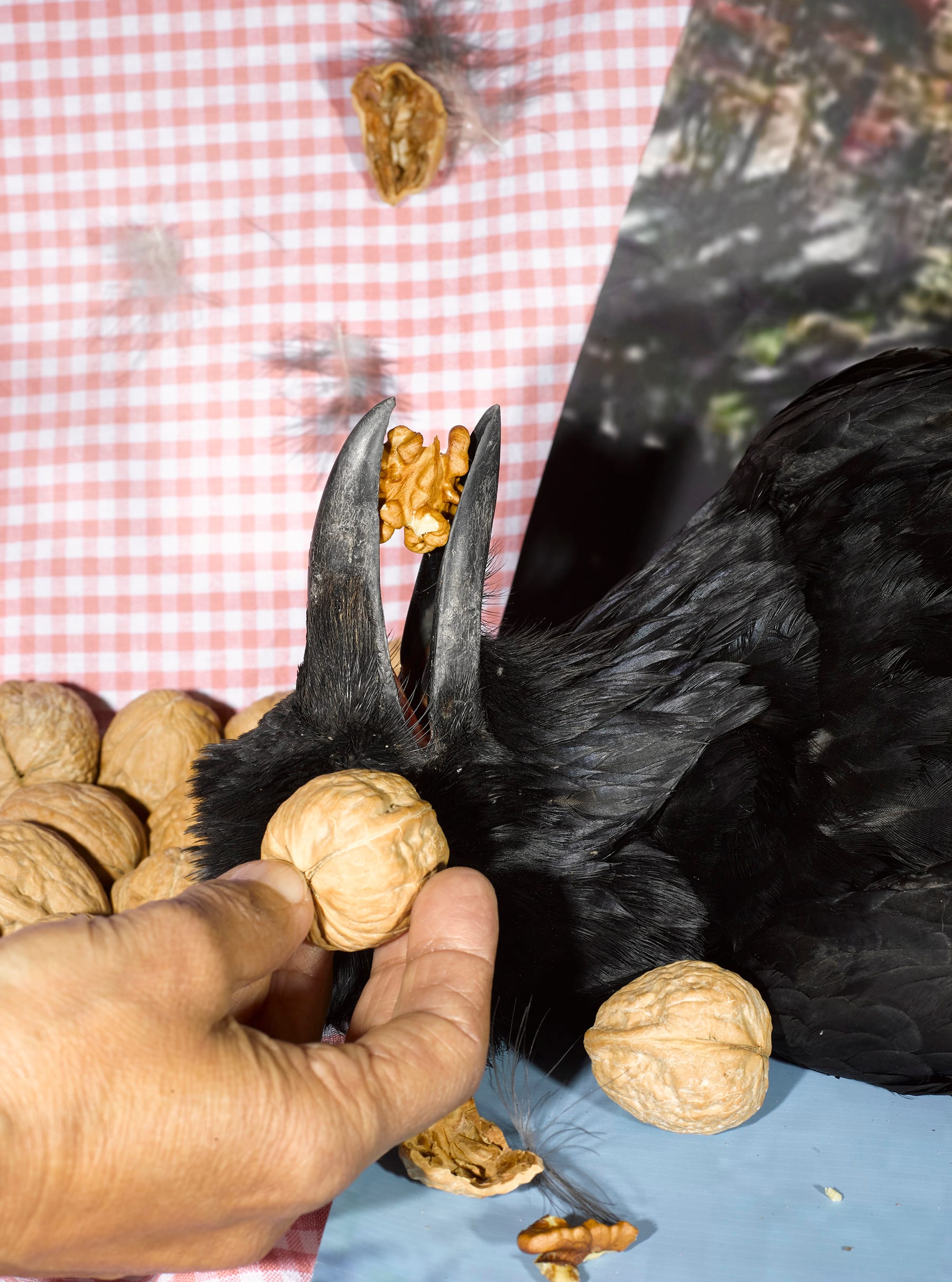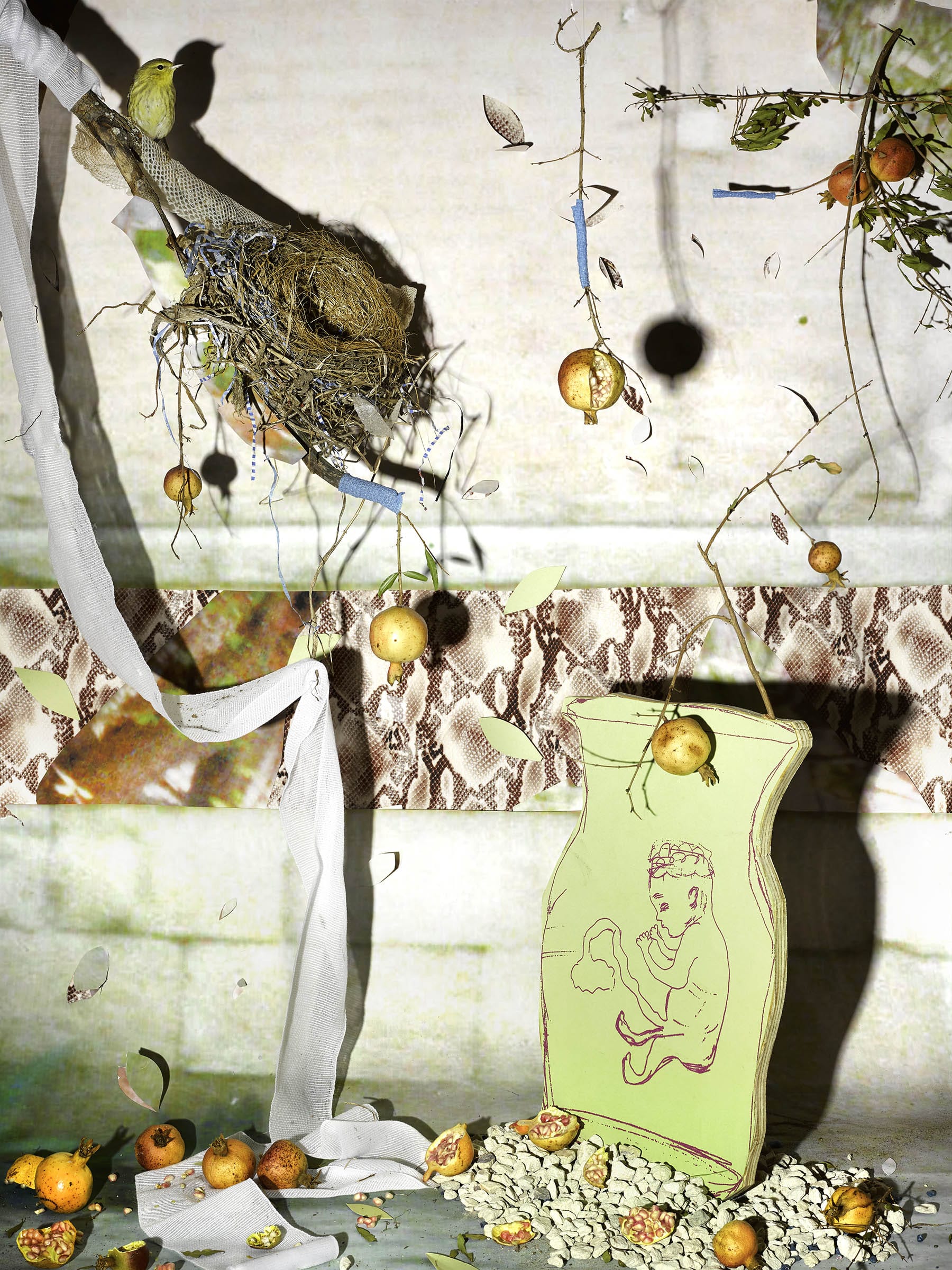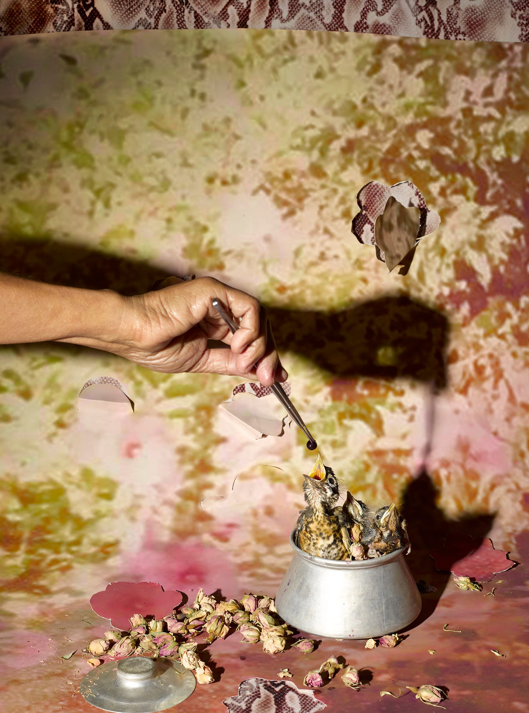 Her most recent photographic series, Ghostwriter (2021–23), takes a much more personal tack. Not only are the stories close to Soleimani’s heart and family, but they are living stories, in a literal sense — she employs the birds and her own parents as subjects. With a unique style that bridges photography, installation, and collage, Soleimani creates densely symbolic and textured tableaux that demonstrate the synthesis between the worlds that Soleimani struggled for a time to keep separate.