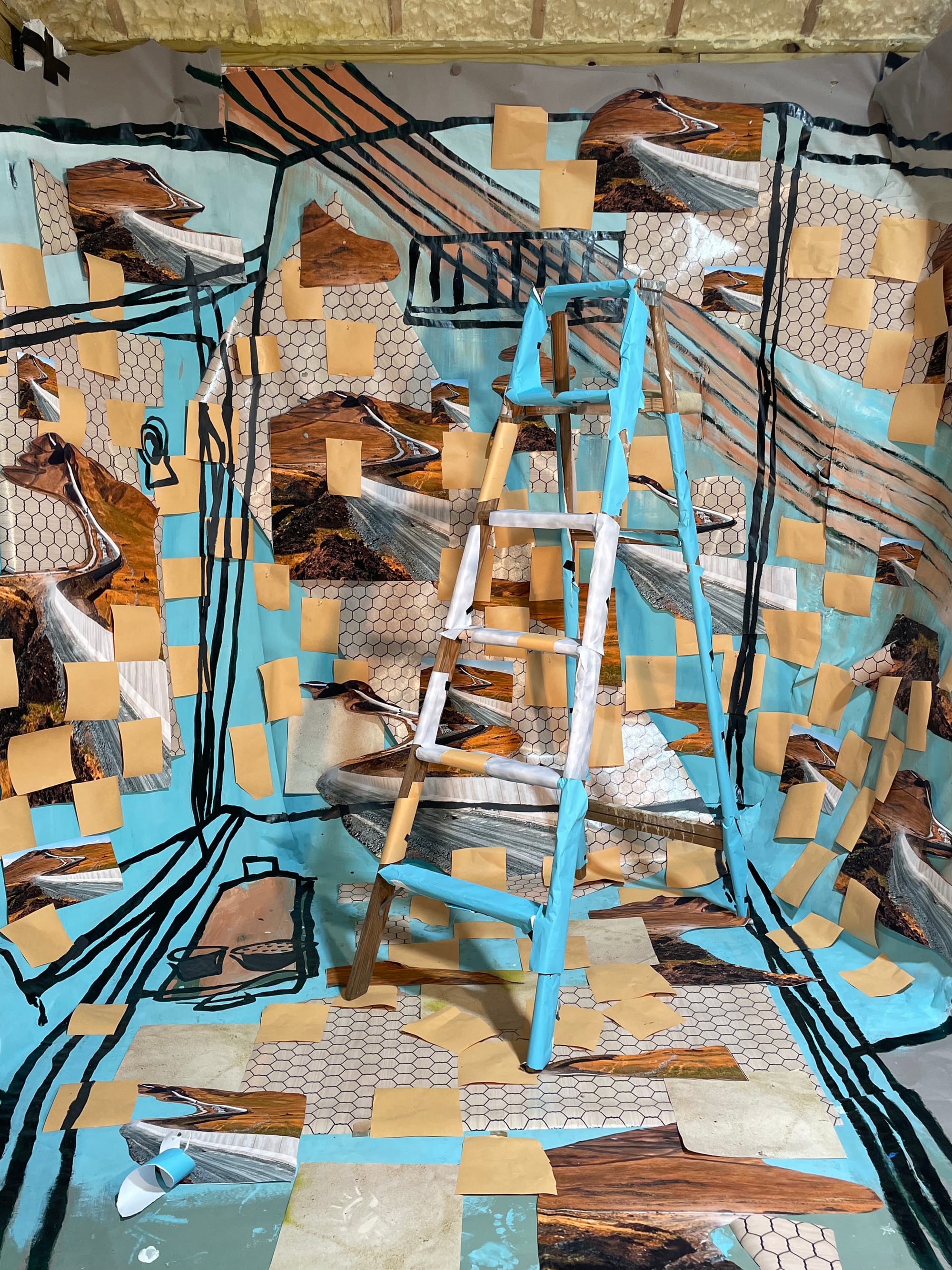 Soleimani’s tableaux involve layers upon layers of visual synecdoche. The mountains through which her father made his escape on foot from Iran become a few rocks, villages are reduced to single structures, and landscapes are shattered into a mosaic of repeating parts. The images are governed by a dreamlike logic, laden with symbolic significance. Soleimani’s consideration of her elements verges on the obsessive: She often pulls from an “object library” that includes crab pots, dried vegetation, chairs, mirrors, and much more, which lives and grows in her studio. The visually chaotic interplay that results demonstrates trust in the viewer to navigate toward their own conclusions. Parsing Soleimani’s imagery is the cognitive equivalent of a rock-climbing wall: It has numerous visual handholds, any of which can open a pathway through the work.
