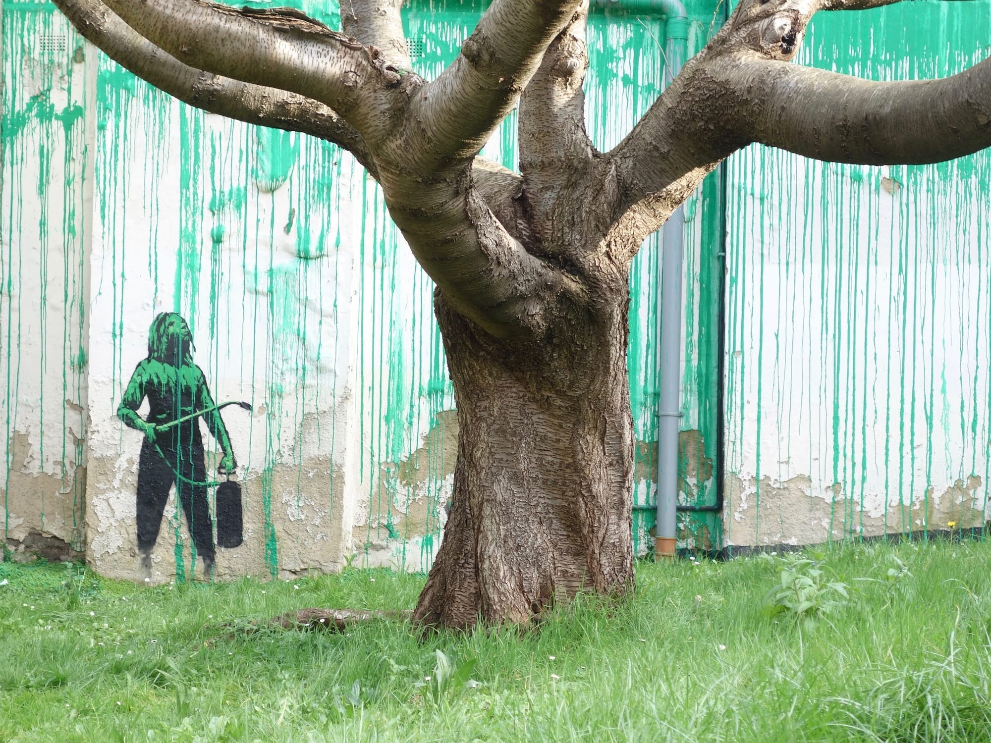 A new Banksy mural emerged in London's Finsbury Park neighborhood over the weekend, to the delight of residents on Hornsey Road. On the side of a currently empty apartment building, the bright-green work aligns with the trimmed limbs of a hedged tree to emulate a weeping willow while a signature stenciled figure equipped with a pressure hose gazes up at the synthetic foliage, drenched in the drips of green paint.