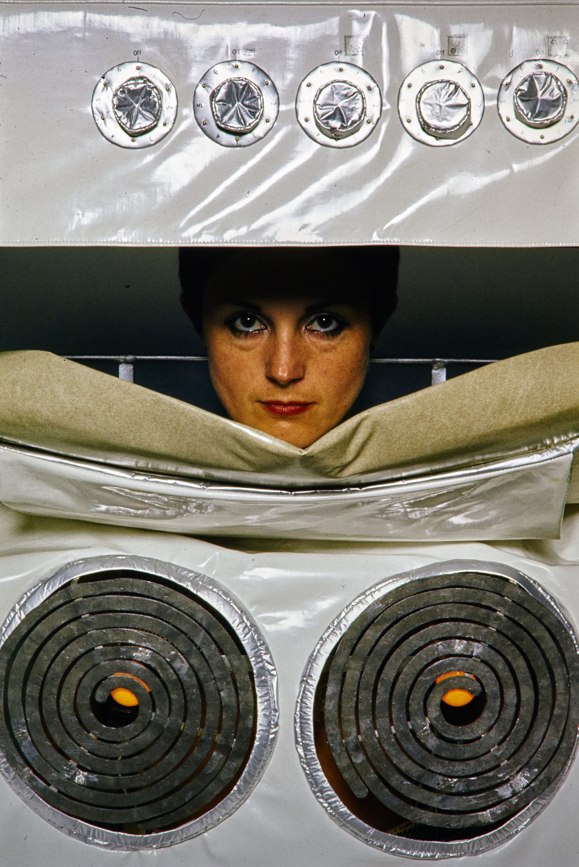 Naturally, because women’s rights intrinsically concern sexual and bodily autonomy, much of the work is intensely personal. The artists unflinchingly use the female body to protest against sexism, social exploitation, and confinement to domesticity, as in Helen Chadwick’s In the Kitchen series (1977) in which she wears PVC costumes designed to look like household appliances. Others take a more intimate approach in laying bare many women’s stigmatized physical experiences. Susan Hiller documents her pregnancy in attentive detail in her print series Ten Months (1977–79), and Mary Kelly captures her own pregnant belly, cropped and up close in the black-and-white looping film “Antepartum” (1973).