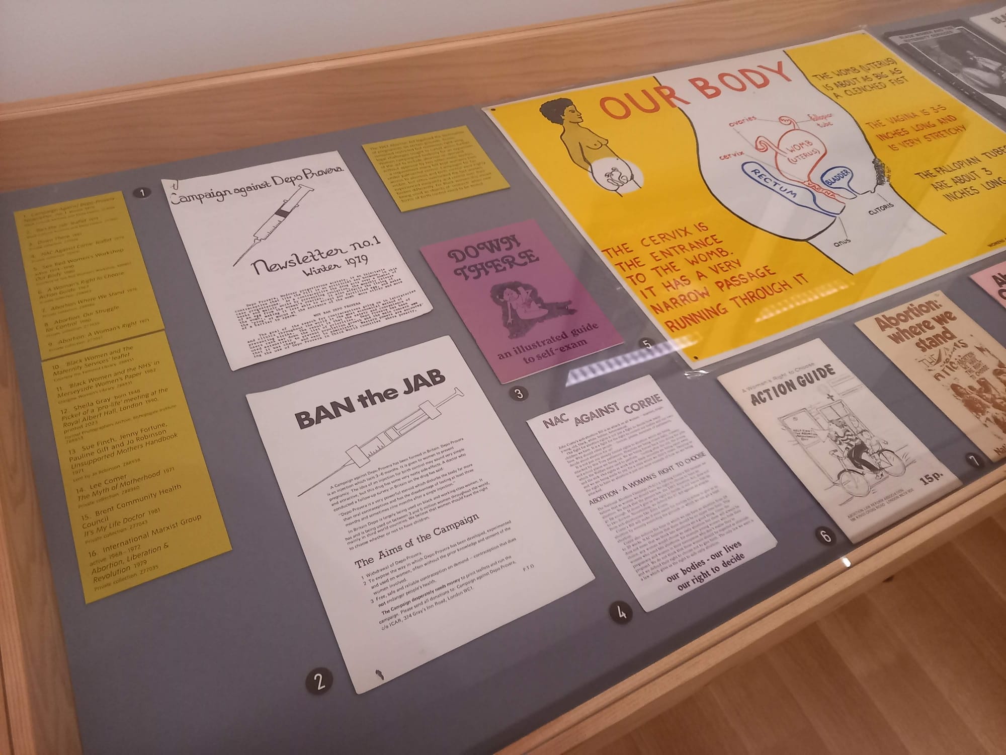 The resulting chronological survey of major events within these two decades begins with the first women’s liberation conference in the UK, progressing through Miss World protests, the formation of the Brixton Black Women’s Group, demonstrations against nuclear development at the Greenham Common, and the punk movement. The show tells a micro-lesson in British history through copious archival material; the video content totals around seven hours, including information about key political meetings and documentation of women’s experience in the workplace, as in Margaret Harrison, Kay Hunt, and Mary Kelly’s installation Women & Work: A Document on the Division of Labour in Industry 1973–75. The sense of a call to arms, of activism and grassroots movements, is extended into the exhibition wall texts themselves, which are pinned onto pseudo-makeshift bulletin boards alongside slogan buttons and pamphlets, and extra wall space erected inside the galleries which takes the form of temporary wooden boards.