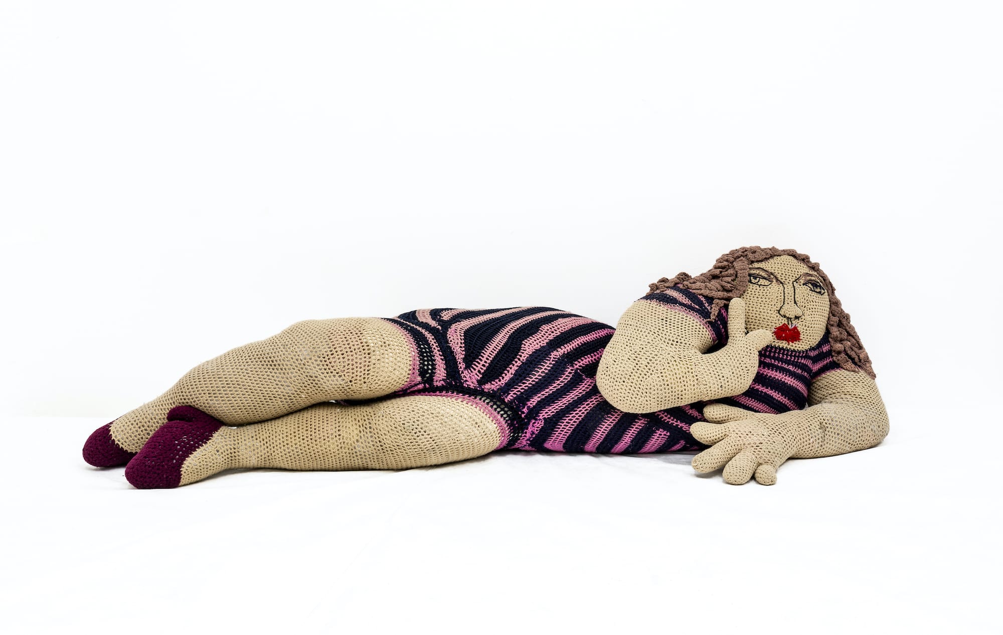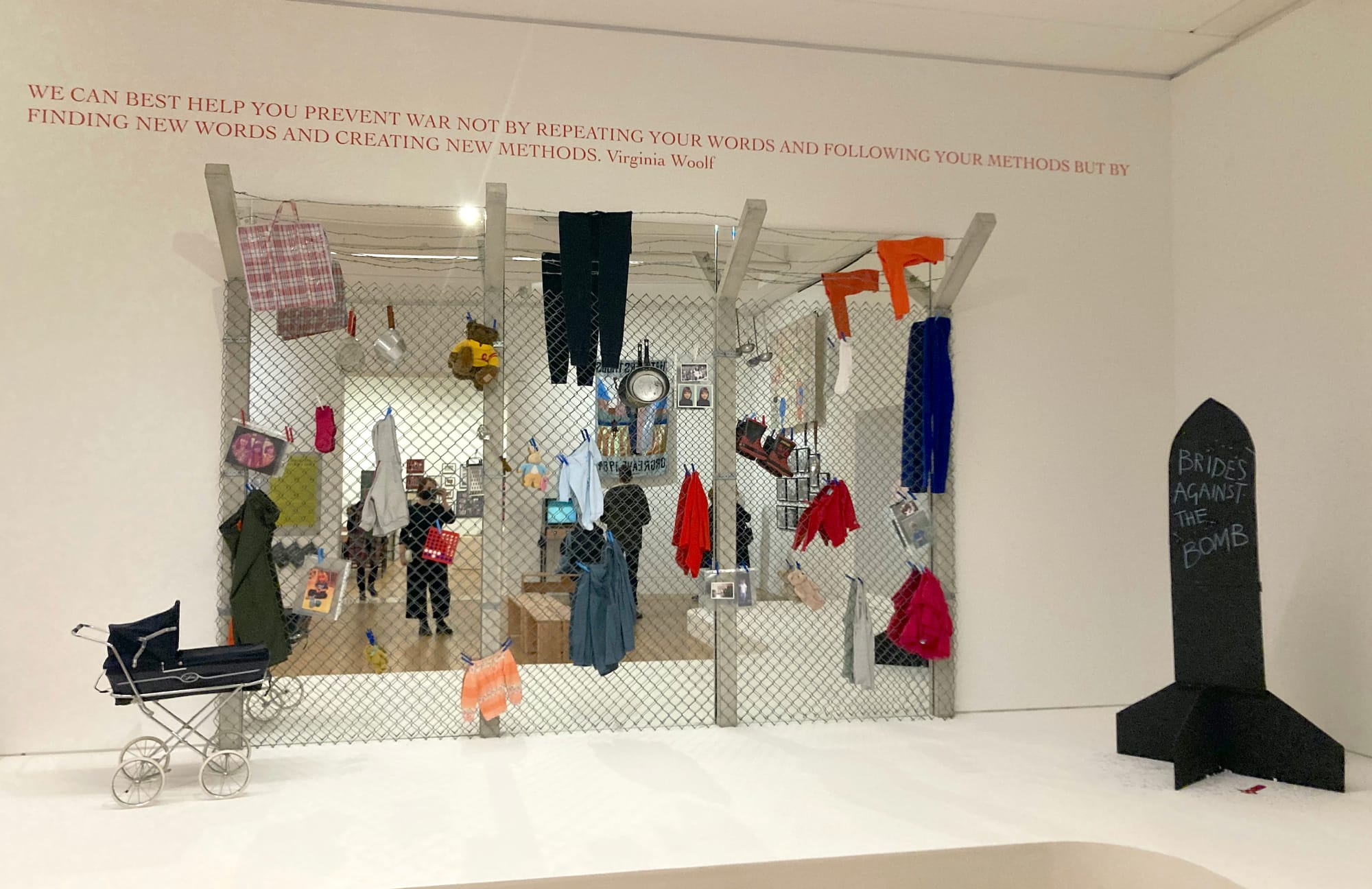 A later section, called “Greenham Women Are Everywhere,” documents the Greenham Common Women’s Peace Camp. From 1981 until 2000, the group blockaded the Greenham Common Royal Air Force base to protest against the nuclear missiles stored there. The Peace Camp is represented in Women in Revolt through black and white photographs of actions against the base and the protestors’ day-to-day activities, as well as some banners and performance props. There’s also Margaret Harrison’s “Common Reflections” (2013), a recreation of part of the fence surrounding the site, which the protestors hung with treasured and everyday objects. This work is straightforward commemoration, reenacting the look of Greenham without its social context. In the gallery, the spoons, photos, and clothes hanging off the chainlink fence are really just things to be looked at, a reflection.