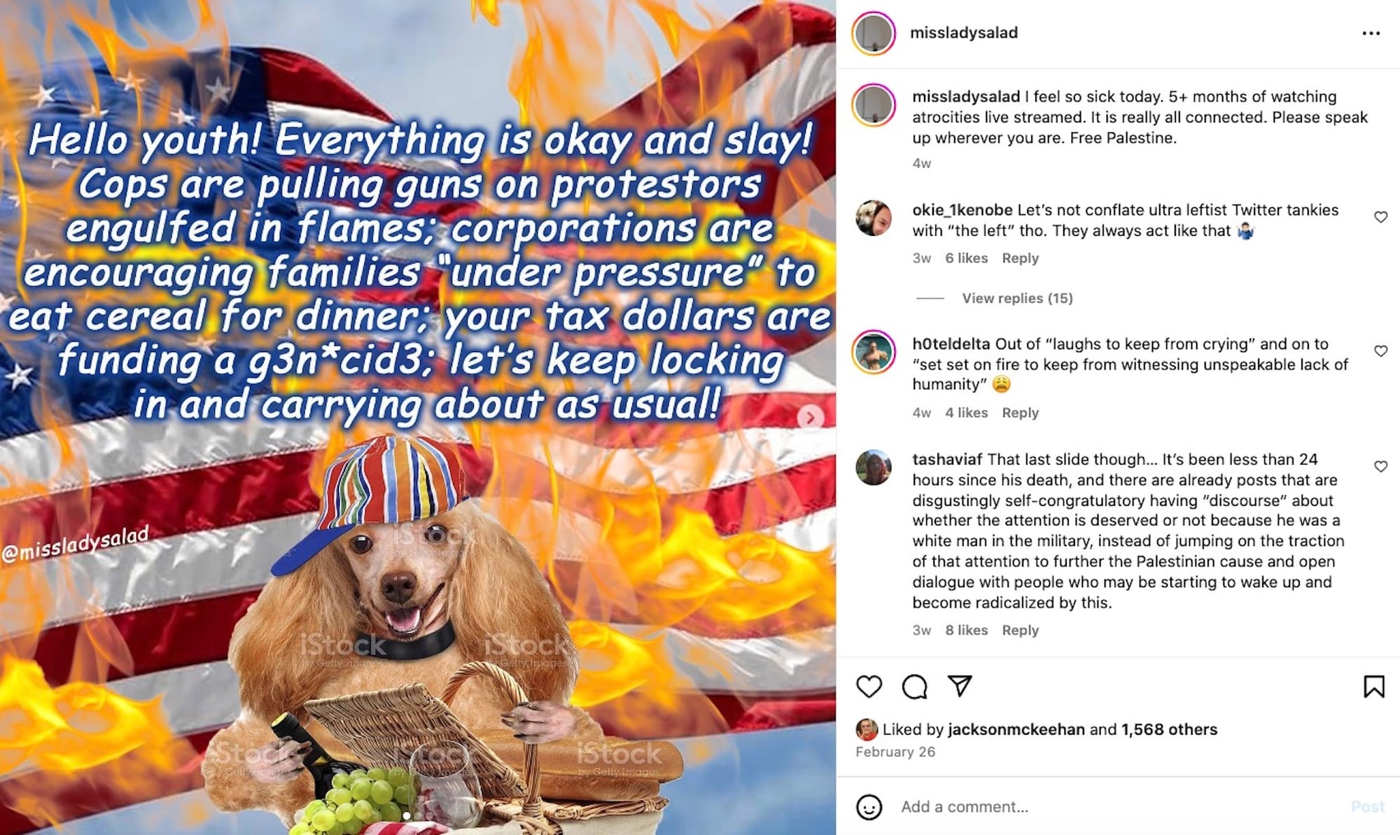 "So, we take control of what information is shared, we push back against neoliberal and fascist propaganda, and we get political and 'political' in spaces that some people are maybe using simply to share images of their dinners," they continued. "And it works."