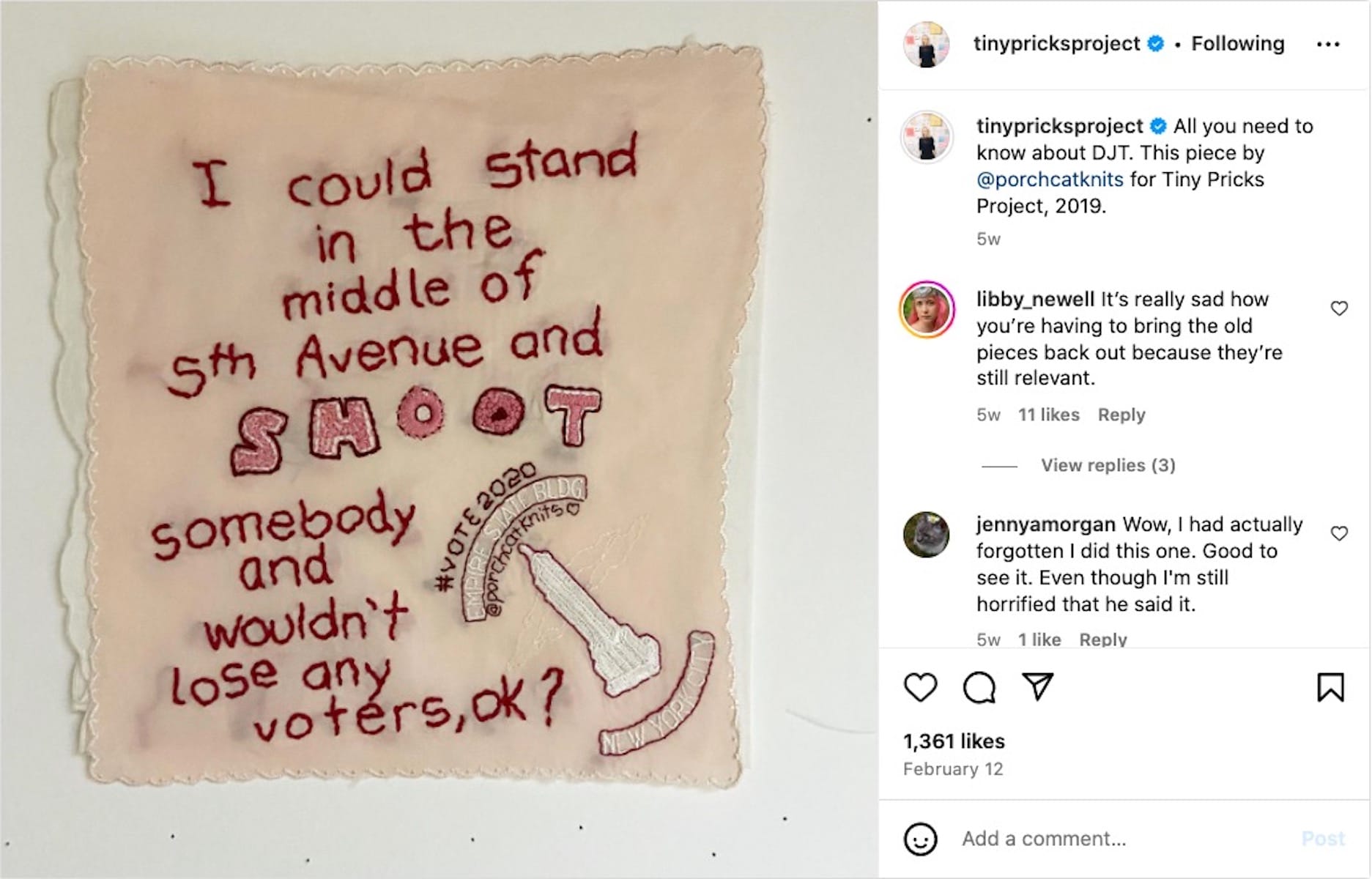 Diana Weymar, the textile artist behind the viral and collaborative Tiny Pricks Project materially archiving the impact of Trump's presidency, among other political content, said that she "couldn't do what she does" without Instagram.