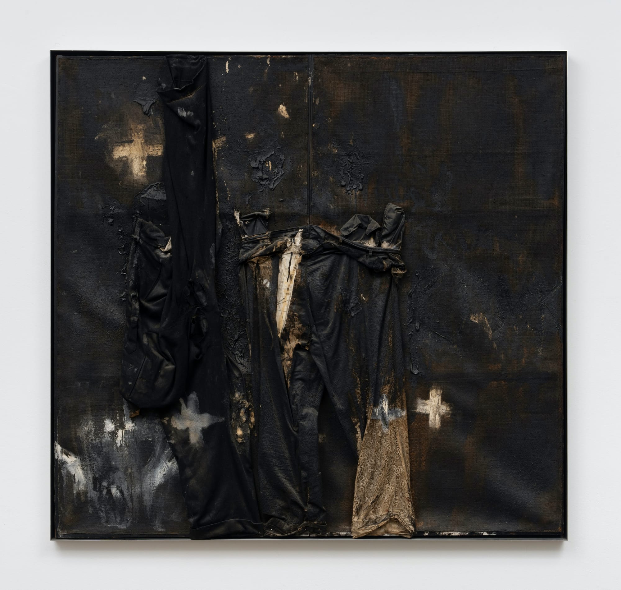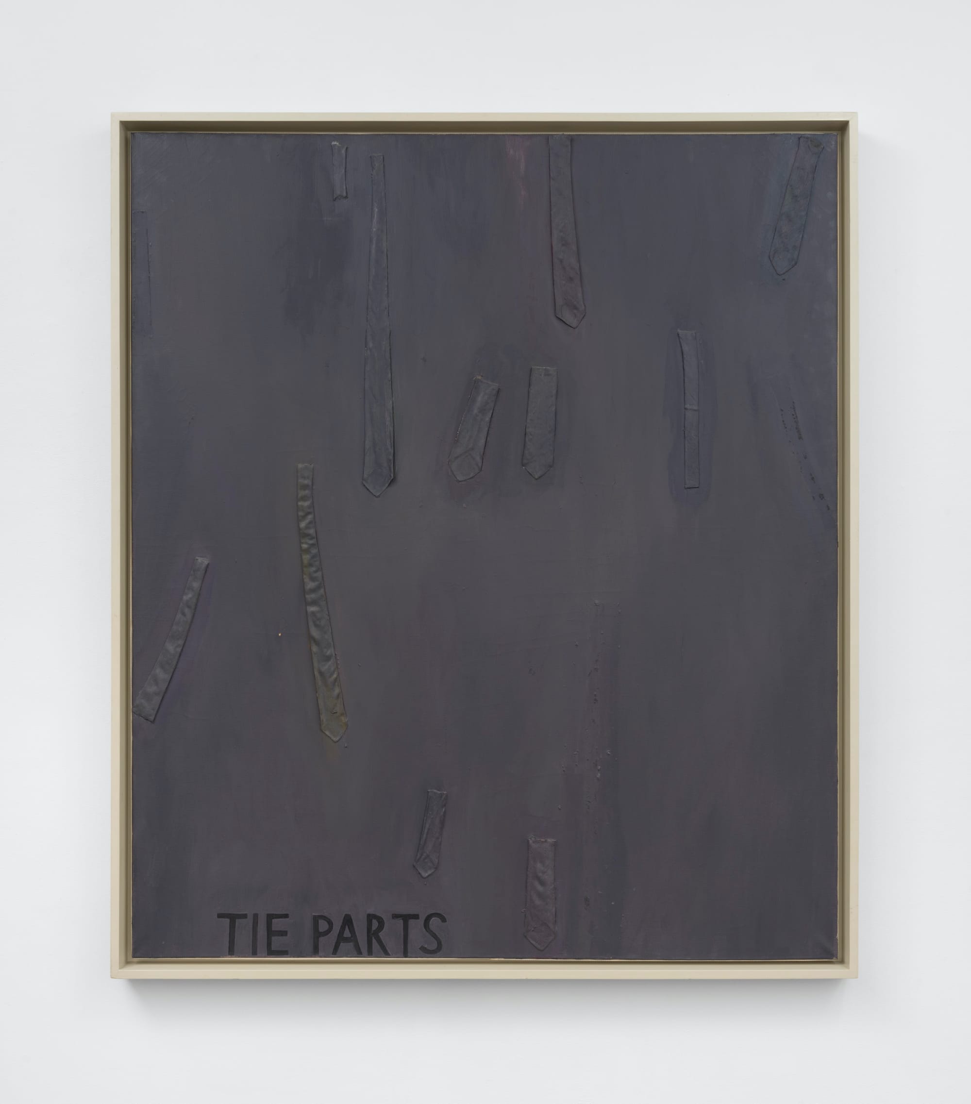 Objects are attached to all 11 paintings in the exhibition, which also includes two sculptures incorporating tools or workmen’s clothing, and two pairs of drawings (one based on color charts, the other depicting a paintbrush). Dine celebrates labor while eschewing commercial products and mechanical means. His commemorations of industriousness are at fundamental odds with the art historians, critics, and curators who have asserted that Pop art is about boredom and picks up where Marcel Duchamp left off. As the art world focused on erasing the hand from art and championed fabrication, Dine neither wavered from his belief in the bond between art and labor nor fetishized it.