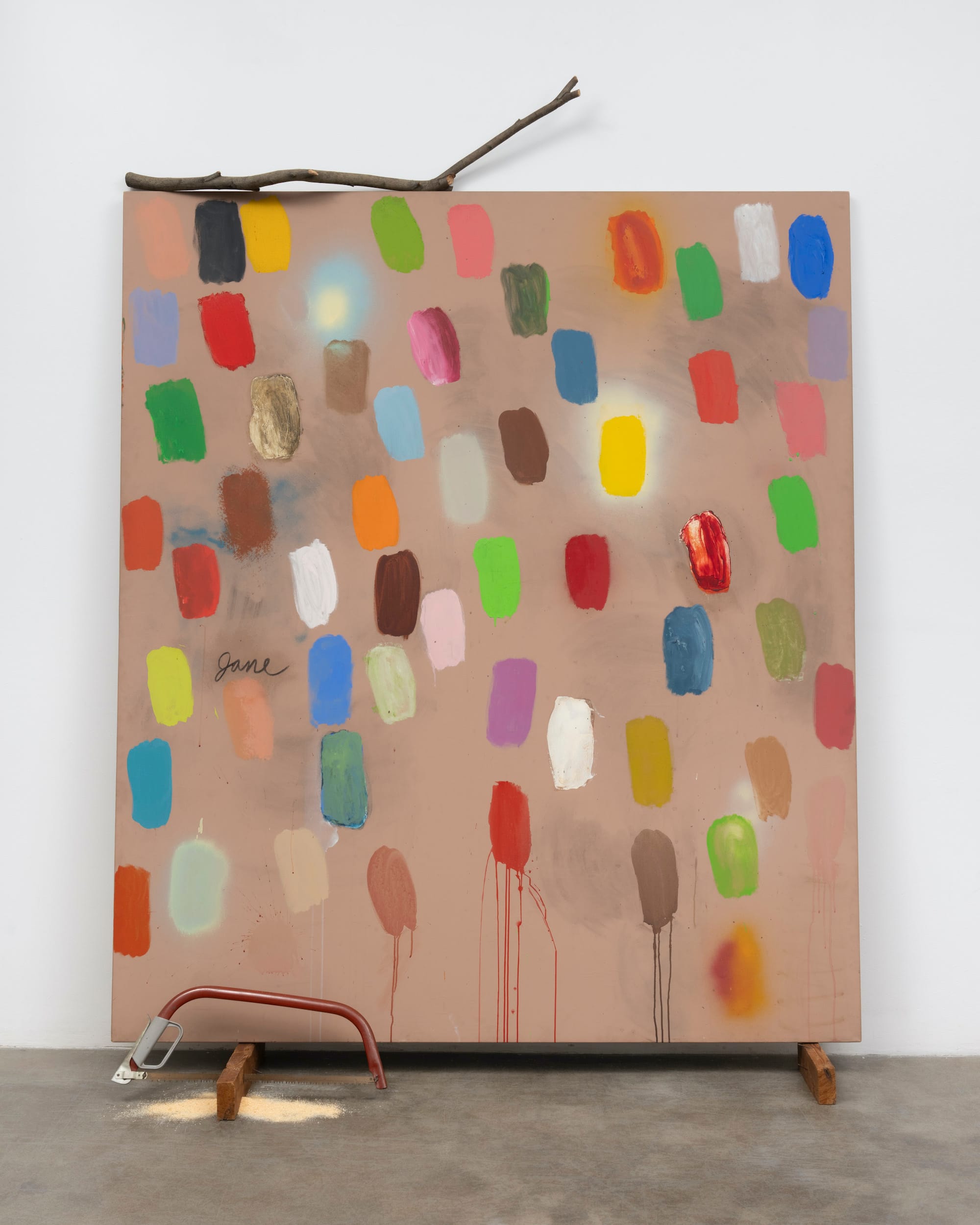 The painting’s title is written on its left side. The work rests on two wooden boards, and leans against the wall. Sawdust has piled up on either side of a hacksaw cutting through one of the wooden boards, implying that the job isn’t complete. A tree branch rests on the painting’s top edge. While nothing is inherently mysterious about what we are looking at, “Jane” does not fit into the conventional categories of “painting” or “sculpture.” The title, and its inscription on the work, indicate that this is a portrait, rather than an abstract painting. That resistance to abstraction animates the work.