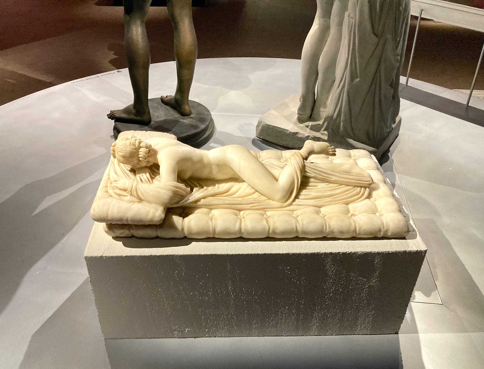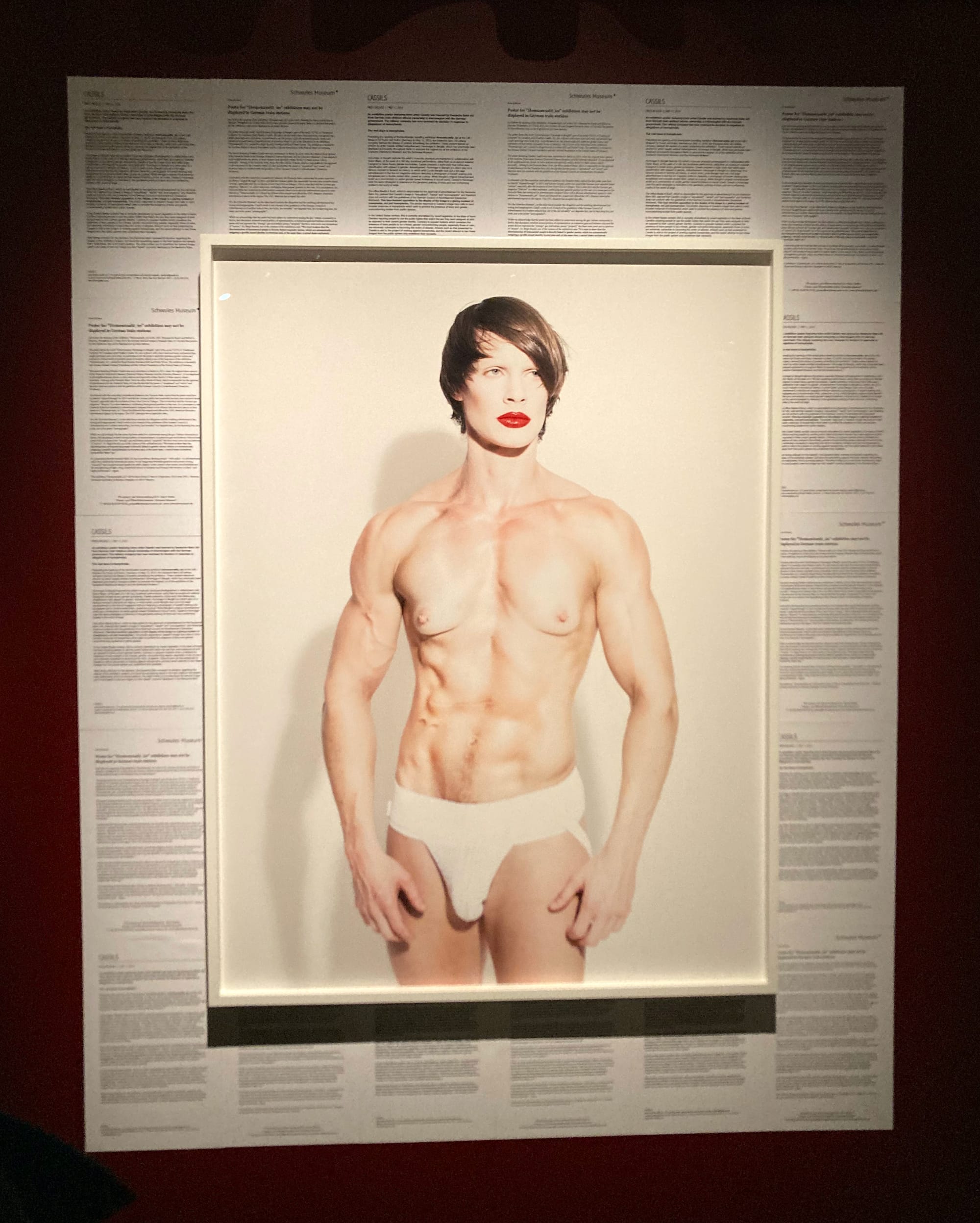 On a busy day, the space is incredibly crowded. The exhibits mostly run around the rooms’ edges, and shuffling from object to object can feel like being on a conveyor belt. There’s a lot of material to take in, not all of it well explained. In the first room are casts of three sculptures: Venus, representing feminine beauty; Idolino, representing an idealized masculine form; and a small Hermaphroditus, which would embody gender fluidity with its breasts and penis. This Hermaphroditus has been censored — castrated by a previous owner — but the gallery label is strangely coy, so unless you recognize the myth or the sculpture it’s not obvious. There’s also multimedia artist Cassils, posing like a bodybuilder in shiny red lipstick in “Advertisement: Homage to Benglis,” but Linda Benglis’s infamous 1974 Artforum advertisement, in which she wears nothing but a double-ended dildo and cat-eye sunglasses, isn’t displayed, so the reference will be lost on many viewers.