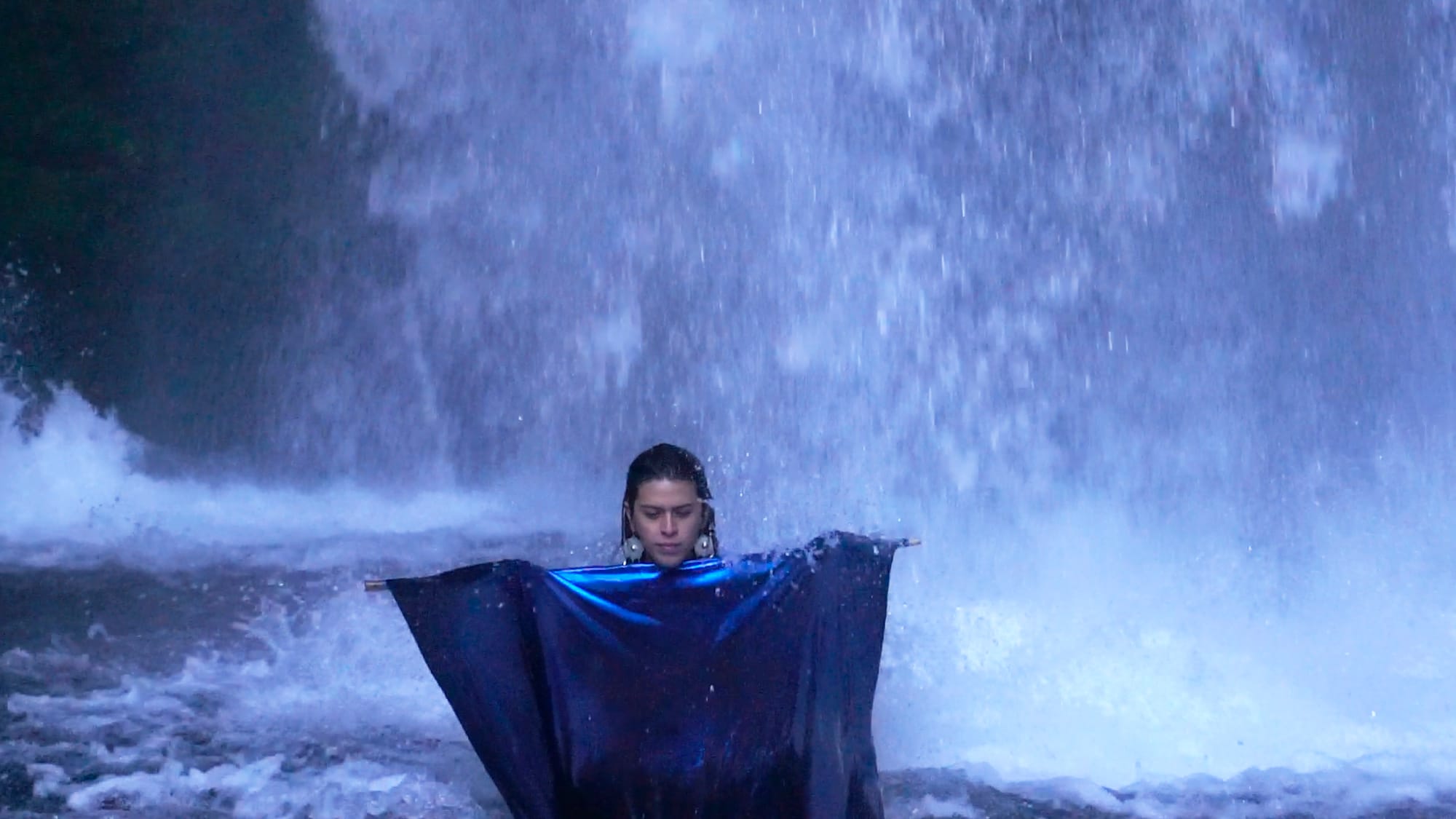 Also on view in the Biennial's onsite film program, Seba Calfuqueo's short film explores trayenko, or waterfall, in Mapuche cosmology through a meditative video performance interlacing the artist’s body with natural landscapes and flowing water.