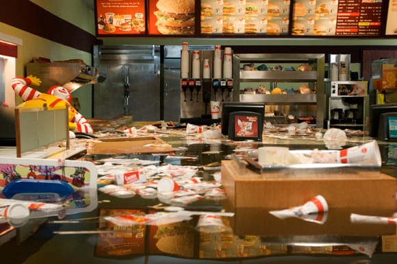 Superflex’s Flooded McDonald’s at Peter Blum — The Danish collective Superflex targets the soft spots of global capitalism and then stages a surprise attack. Whether they’re setting up free stores, making Creative Commons beer recipes, or looking for the connections between Danish banks and Hurricane Katrina, they seem intent on making statements about our current financial climate. In the work they exhibited earlier this year at Peter Blum, “Flooded McDonald’s,” which had a life online before it did in the gallery, they hit a high note as they went beyond their often dry graphics to pair their artistic vision with aesthetic accomplishment. The resulting work is a surreal cinematic tableau that transforms a cookie-cutter fastfood restaurant into a metaphor for environmental disaster and corporate hubris.