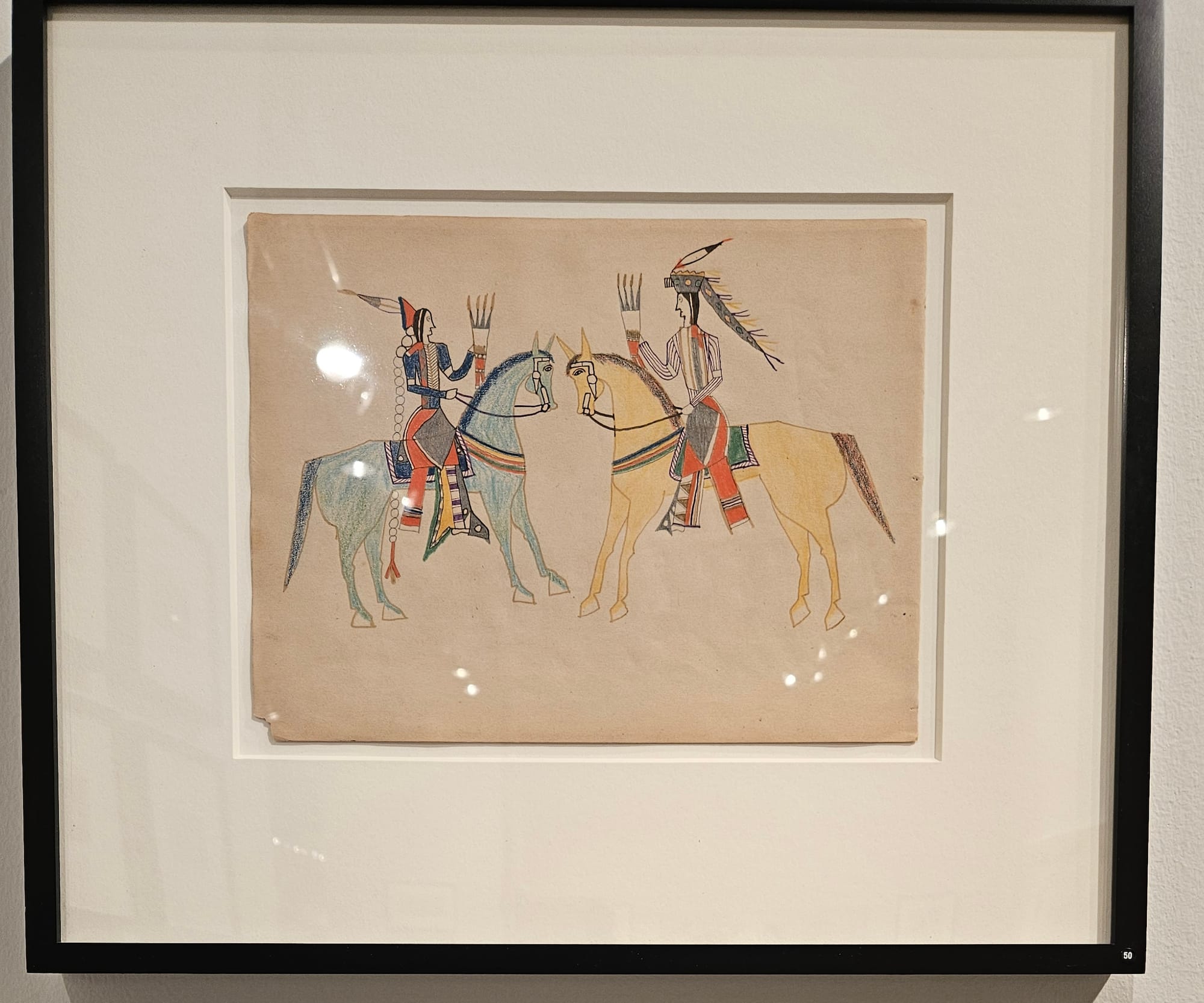 What was not mentioned, by either the galleries or critics, is that the exhibition featured several drawings from ledger books that were auctioned off by Bonhams in Los Angeles in 2022. Representatives for the Kiowa and Cheyenne and Arapaho Tribes attempted unsuccessfully to halt the sale, based on the arguments that the ledger books represented “significant cultural patrimony” and were created by incarcerated artists, calling into question the “chain of custody of the objects,” as Chairman of the Kiowa Tribe Lawrence SpottedBird wrote in a letter to Bonhams.
