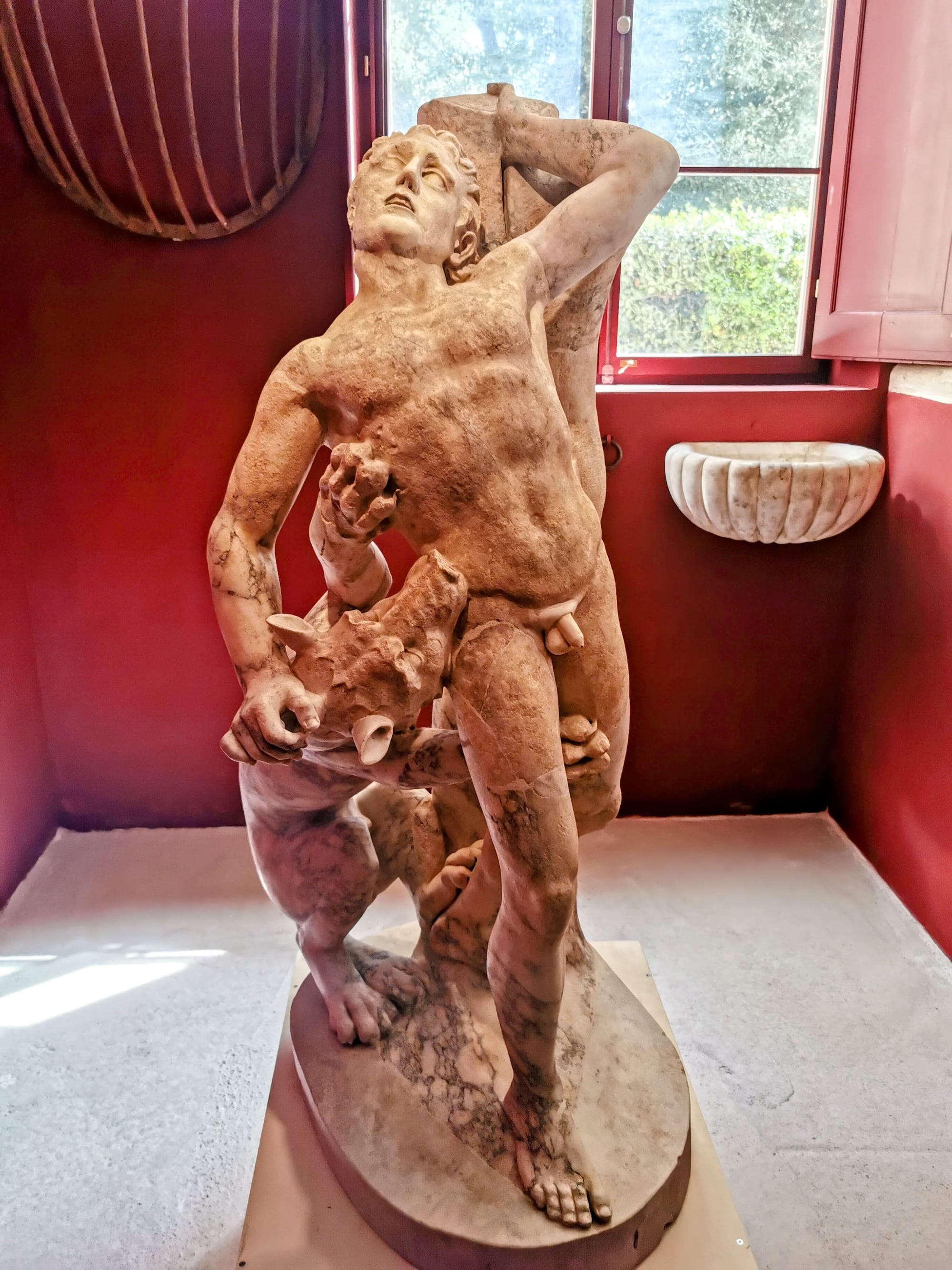 Inside the stall is a restored sculpture of a Milo of Croton, a Greek historical figure famous for his strength who was torn to pieces by wolves after boastfully offering to split a tree with his bare hands and then getting trapped by the trunk. However, the original sculpture did not depict him at all. The ancient part of this piece is a nude male torso with a dog head biting into his side and a paw mauling him. These once belonged to the monster Scylla, which had six dog-headed appendages, tearing apart one of the sailors captained by Odysseus.