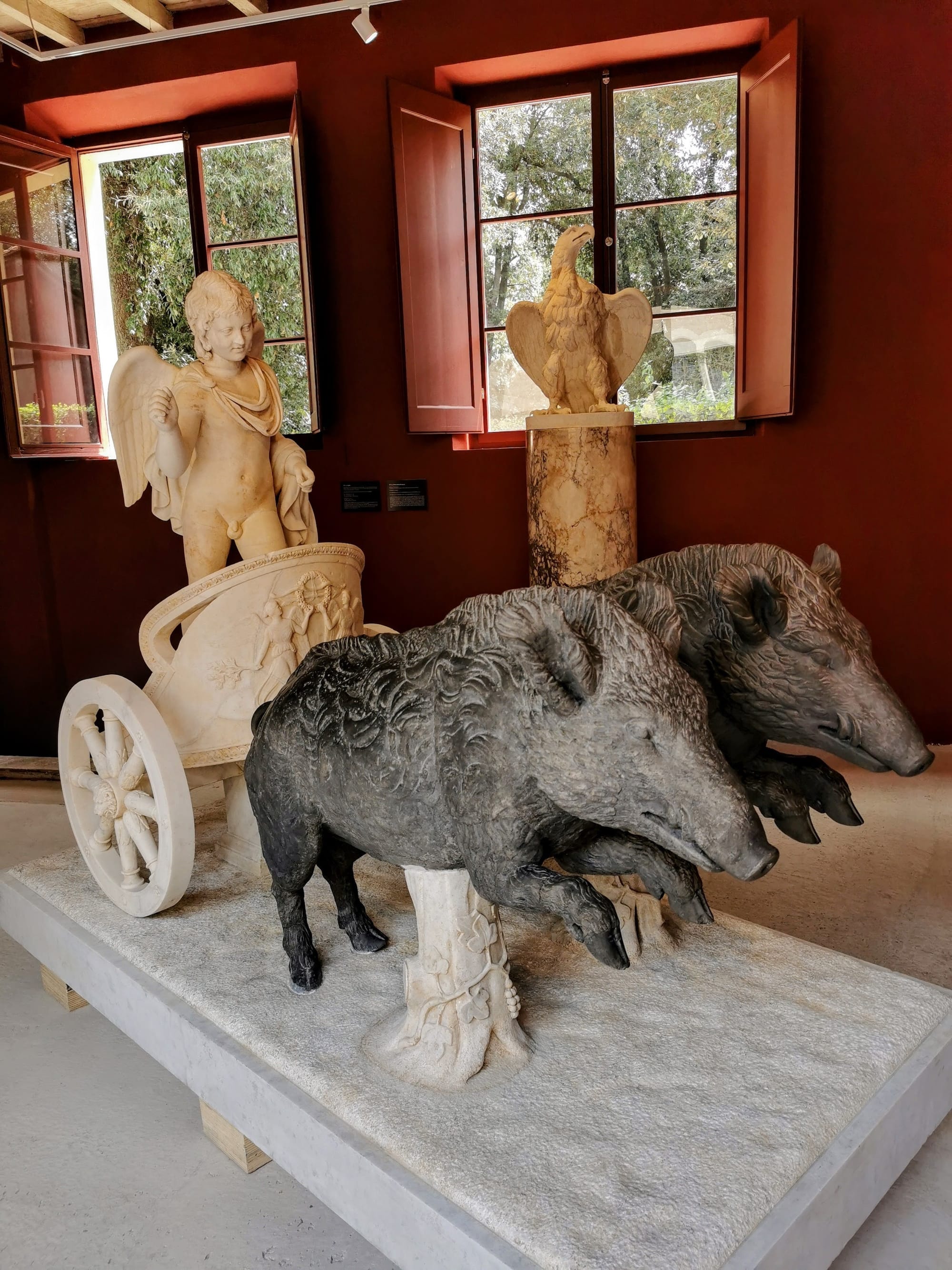 The 19th-century “restoration” assigning the sculpture its new identity as a Milo of Croton is clever, but has created an entirely new statue. In the second room, a massive marble chariot carrying Eros, the god of love, being pulled by two wild boars dominates. The group of sculptures as a whole has very little that is ancient about it, but is nonetheless a splendid pastiche warning about the uncontrollable force of love. Despite its small size, the display offers a tantalizing taste of the treasures of the Torlonia collection.