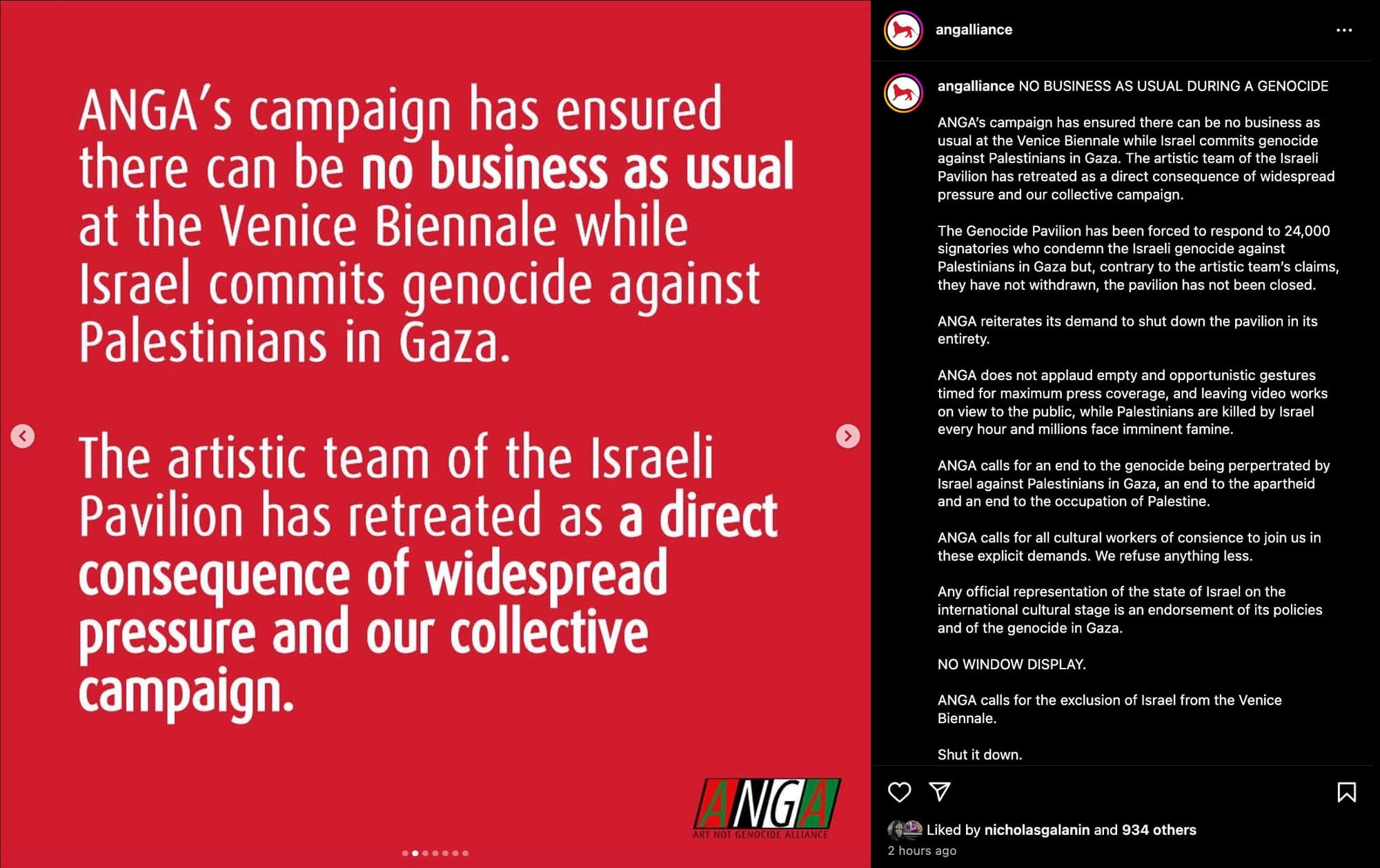 "ANGA does not applaud empty and opportunistic gestures timed for maximum press coverage, and leaving video works on view to the public, while Palestinians are killed by Israel every hour and millions face imminent famine," reads a section of the group's Instagram statement, reiterating its demand that the pavilion close entirely and underscoring that the artist and curators halted the exhibition only after pressure from thousands of petition signatories.