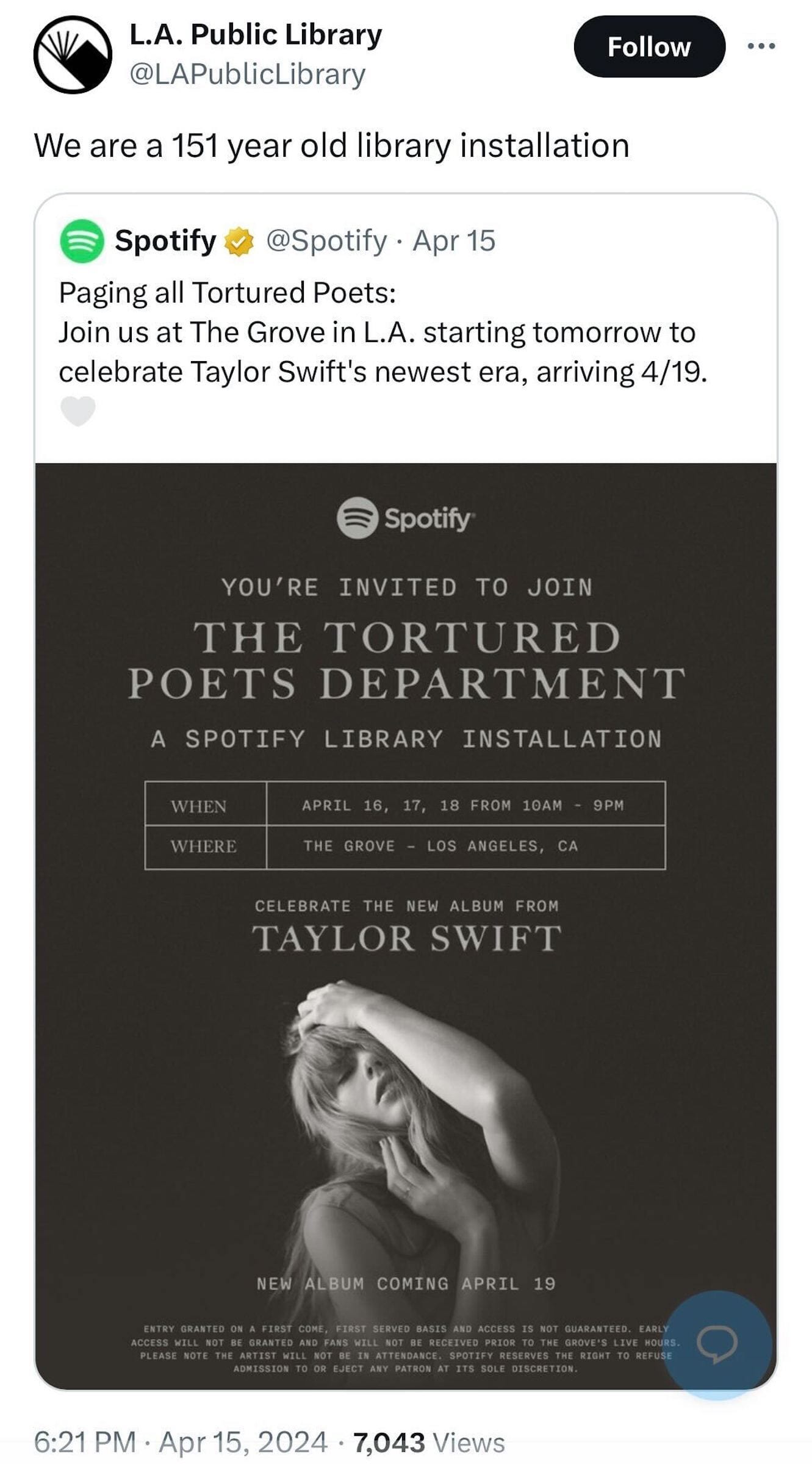 Regardless of whether audiences find a "library installation" tacky or tasteful, the pop-up attraction is just the latest public relations gimmick Swift is currently using to promote her new music — a QR code mural in Chicago that is part of an international Swiftie puzzle apparently linked people to a YouTube short with the message "Error 321" and a faded "13." At the end of the day (9pm for those in line at The Grove), this seems to only fuel her devoted fanbase.