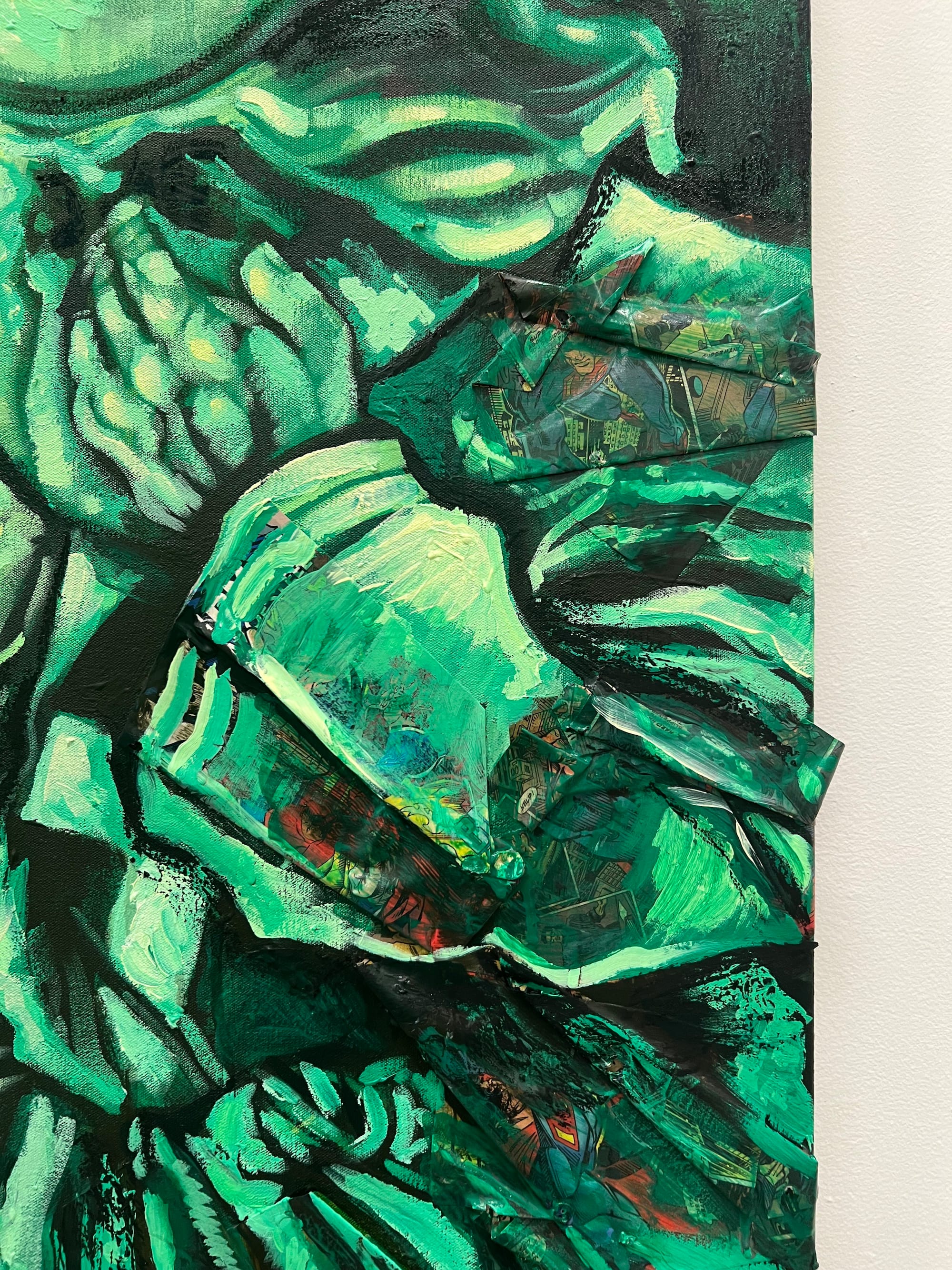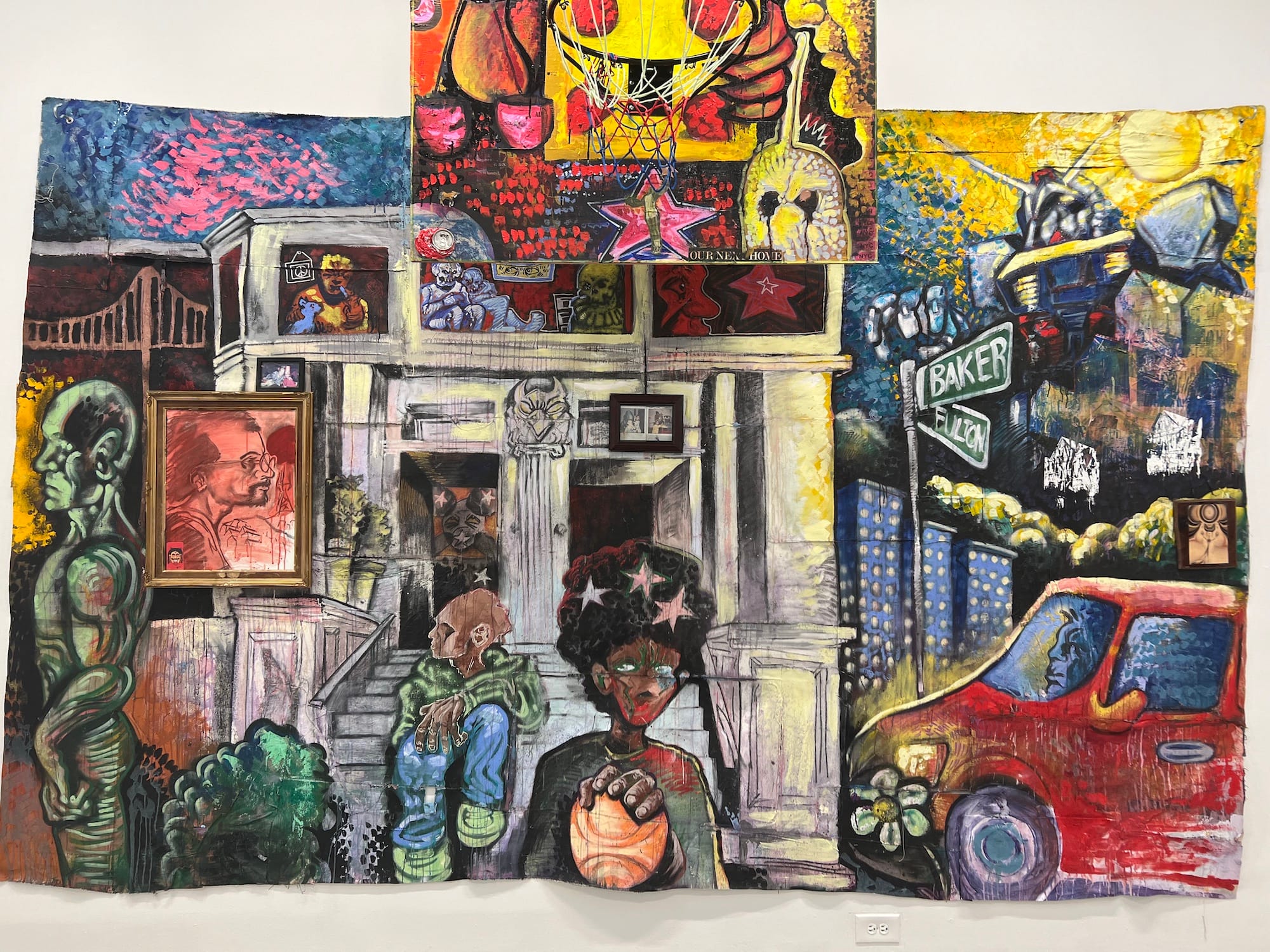 Finally, the work of Virgil Warren makes me feel like we’ve finally done something right in the art world. The ease with which this generation of artists toggles between high and low is so evident that it seems almost ridiculous to categorize things into those old boxes. Pages from comic books are collaged into the ruffled jacket of a figure. I actually spotted a check made out to Warren in one of the works (I hope you cashed it, because money doesn’t come easily in the art world). A Koreaboo impulse is most certainly afoot, and it’s darling — and accurate: Where are the references to massively relevant K-Pop and K-drama and K-everything in high art? (Excluding you, Diane Severin Nguyen, you’ve got it going on.) In the massive “Paradise 615” (2024) — 12 feet across, with an attached basketball hoop to boot — family photos are arranged in such a way that they become the post and lintel of a building at the center, helping to structure and compose the piece.
