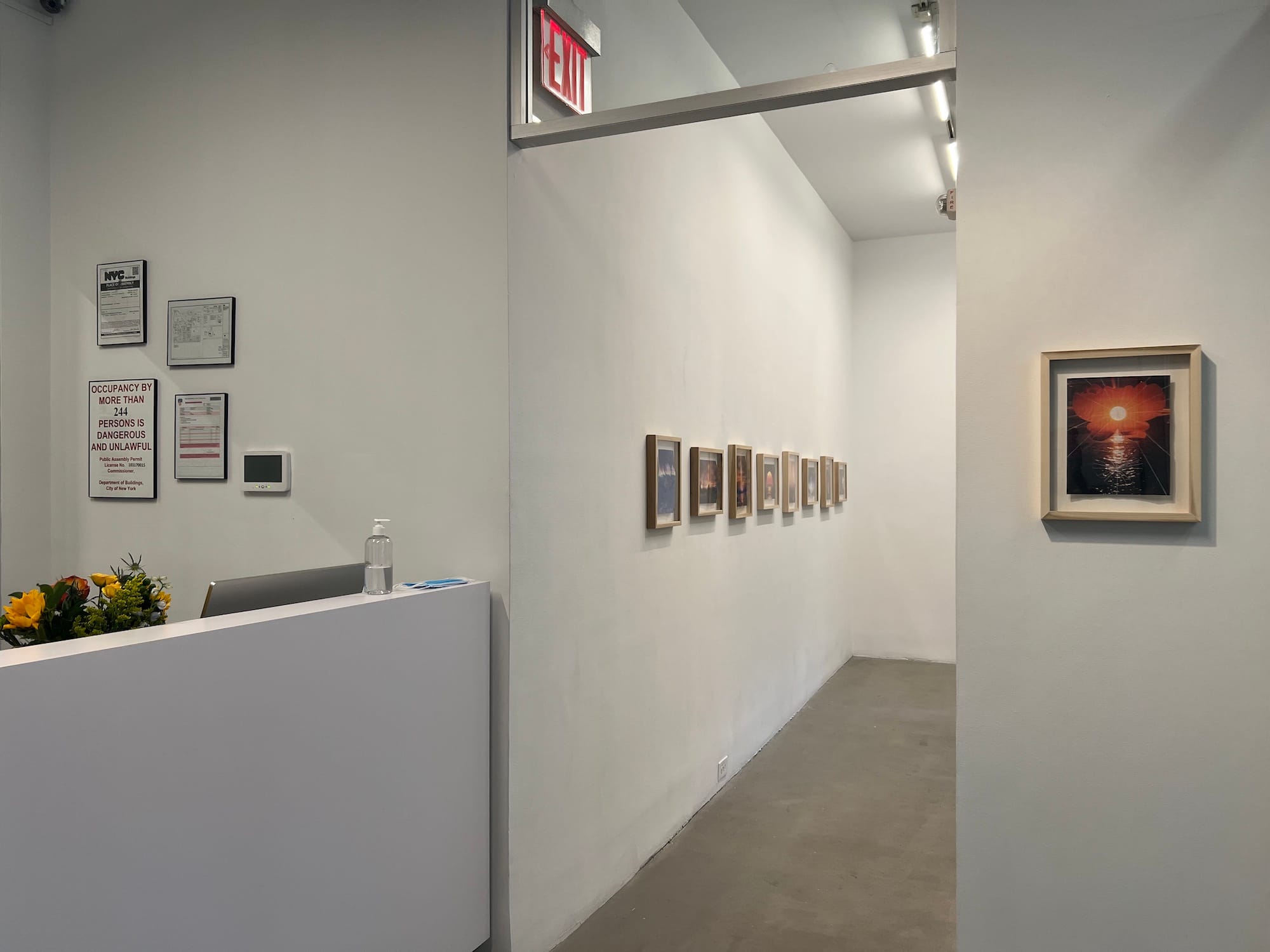 Installation view of the foyer of Spyglass, facing to the right of the entrance with a glimpse into the project space, featuring works by Robin Gammons