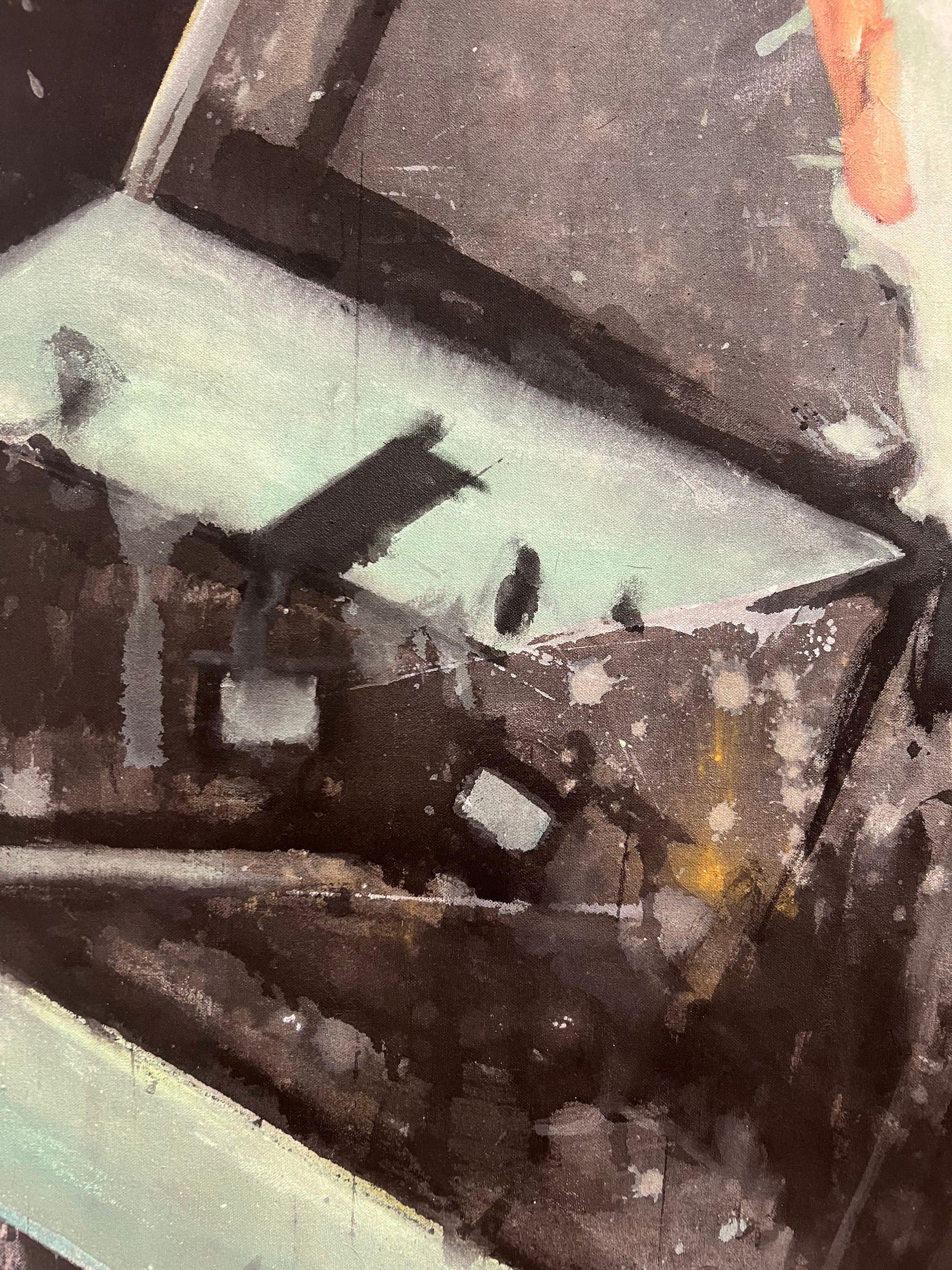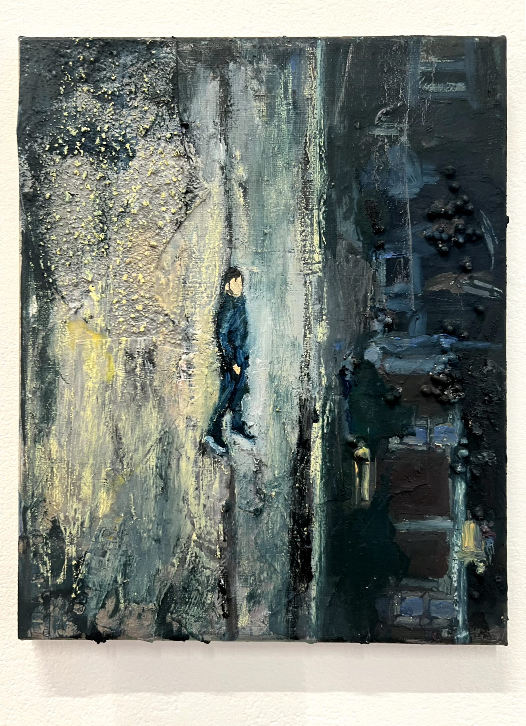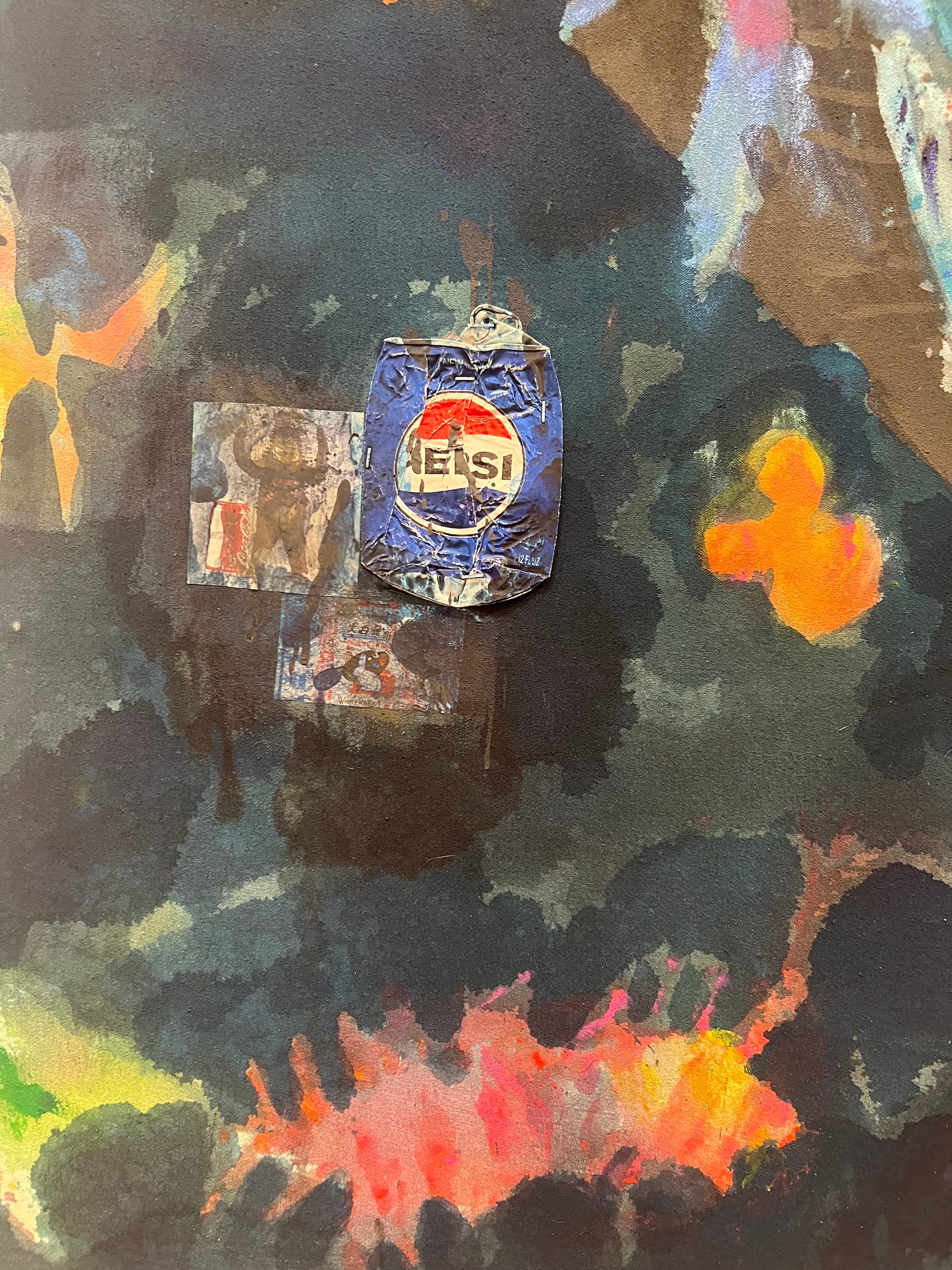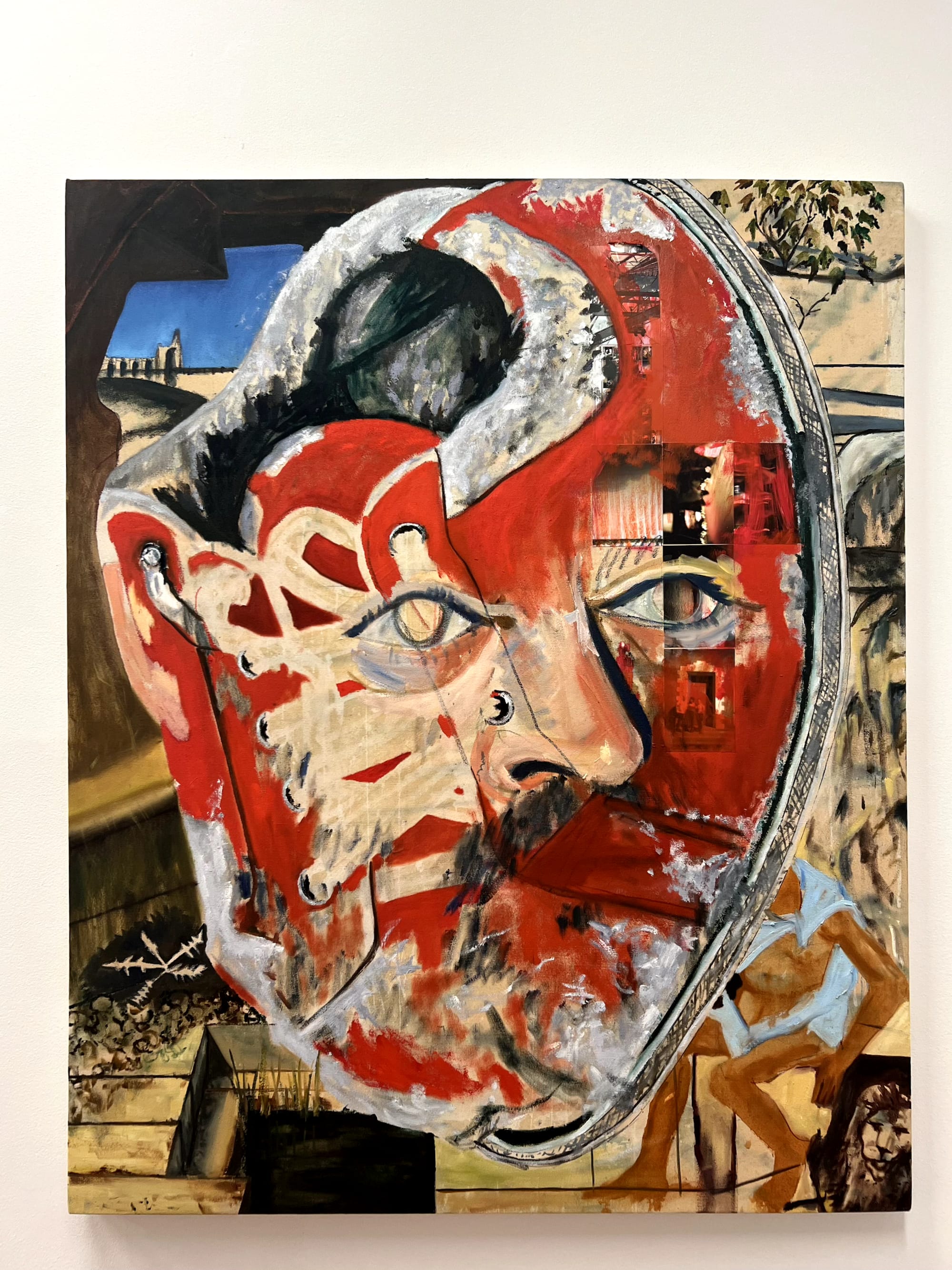 Forrest Knight’s paintings succeed most when he uses a light hand with figuration. “Self portrait as a red shoe” (2023) is my favorite of the series. De Chirico-like landscapes meet found photos and symbology that feels recognizable but personal. Superimposed atop is a massive, chalky red face, the shape of the shoe warping the silhouette of the head and vice versa. A bottle cap pressed into the cartilage beneath the rim of the ear is among the various media in the series, as is the crushed Pepsi can in a nearby portrait; oblique details like that better illuminate Knight’s interiority and lived experience than an image of his face. “Untitled” (2023), too, is a can’t-miss. It’s a tiny canvas isolated on a massive wall to the left of the first gallery (the curators ought to be applauded; as with Gammons’s work at the foyer of the show, this display stretegy works well). A faceless figure is set into the far background of an already diminutive frame, its rough, thickly bricked background evocative of the works of Martin Wong.