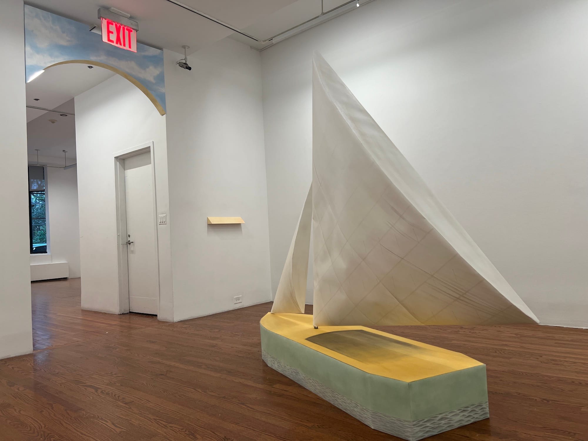 The work of Samuel Alexander Forest, in what the gallery attendants refer to as the “sailboat room,” feels like a breath of literal fresh air. As you might expect, the room is dominated by a massive, slim boat: from certain angles, the sail, which winnows from a point at either end to an oblong semicircle at its thickest, looks like a Brancusi. But it’s not minimalist in any sense — being a massive sailboat kind of gets in the way of that; turn a couple inches in either direction and it’ll billow open again. Its detailing is generous, too: Rippling waves hem the edges of the hull, and pillowy ruffles lend softness to the sail.
