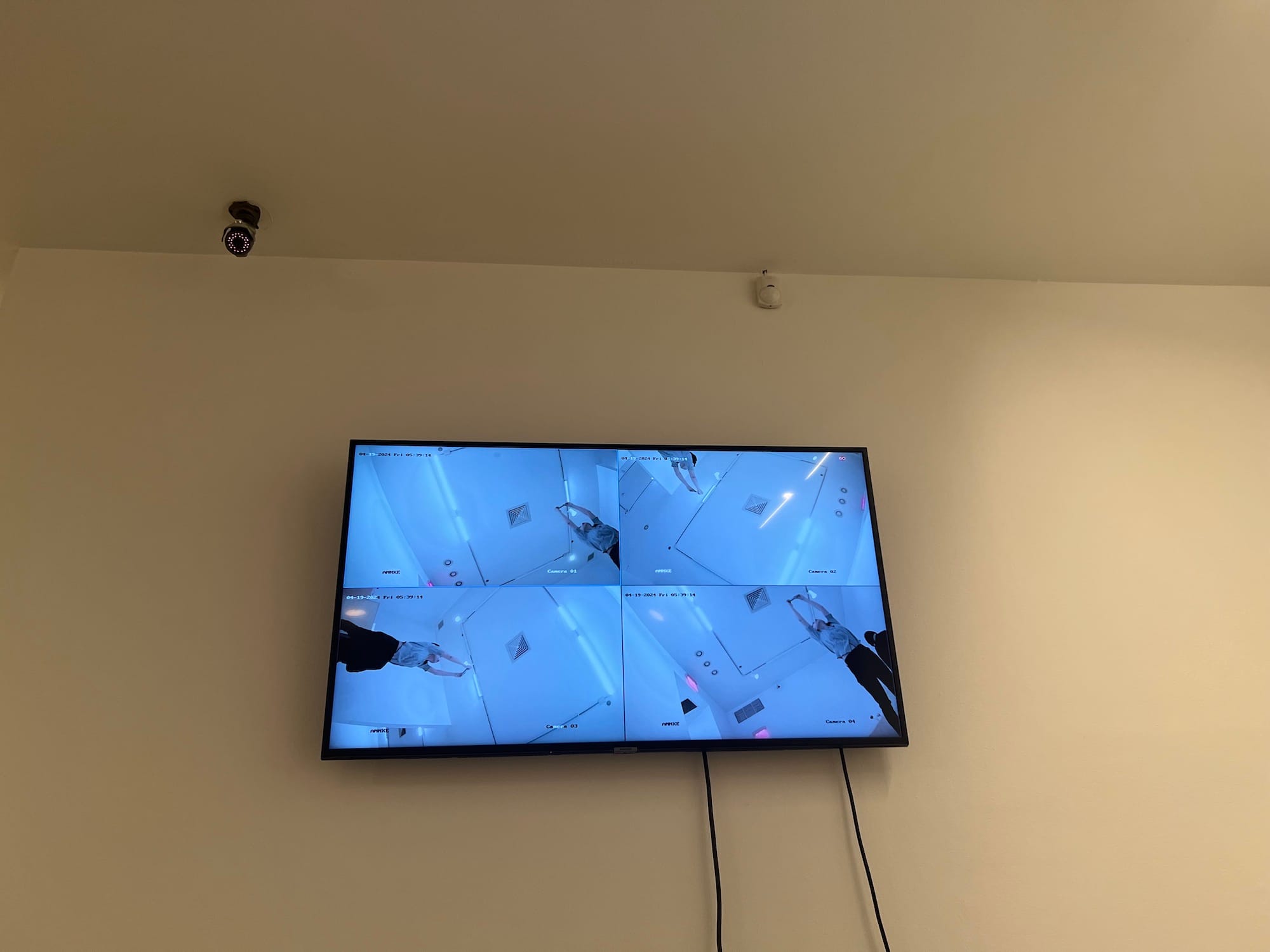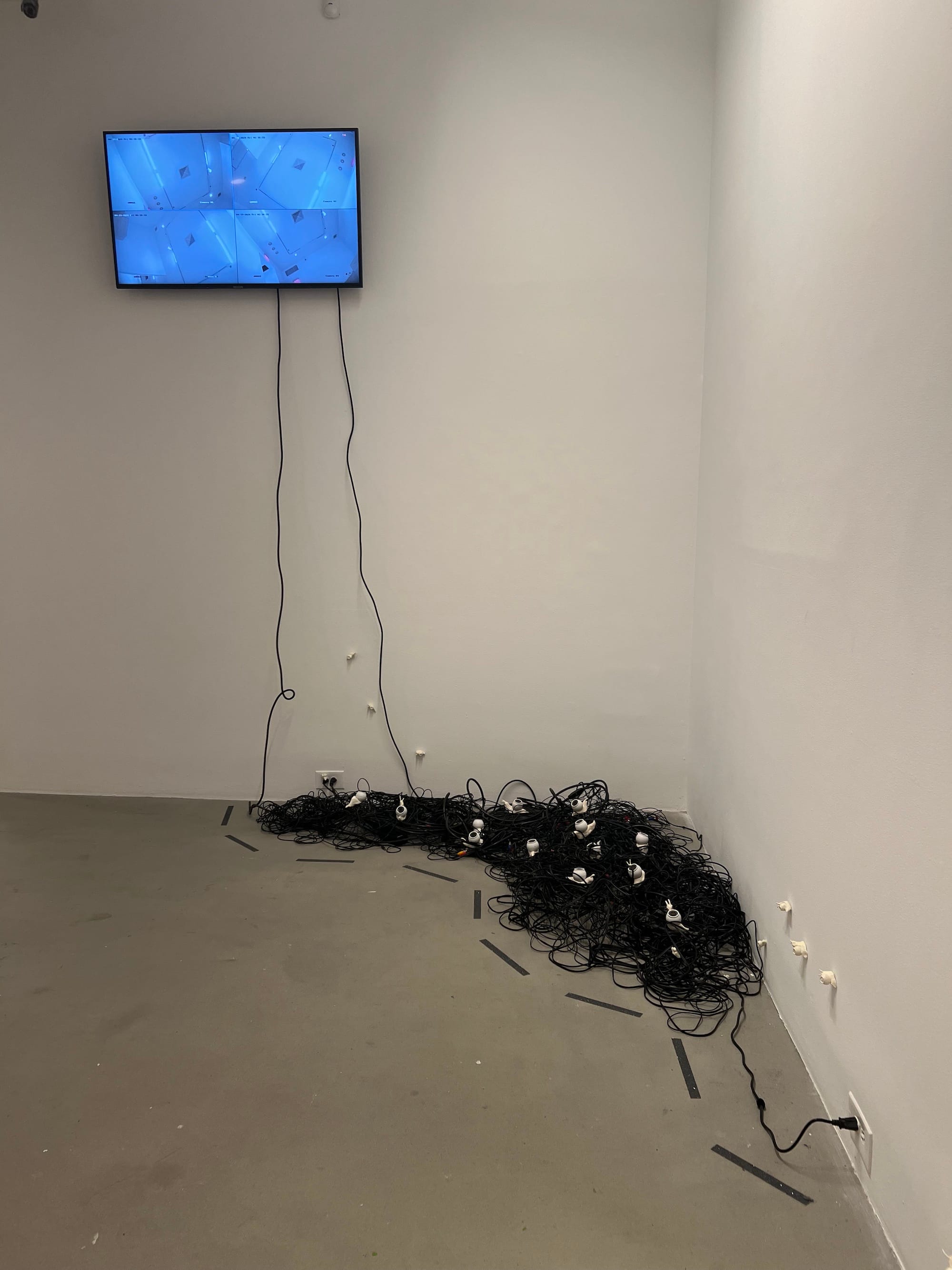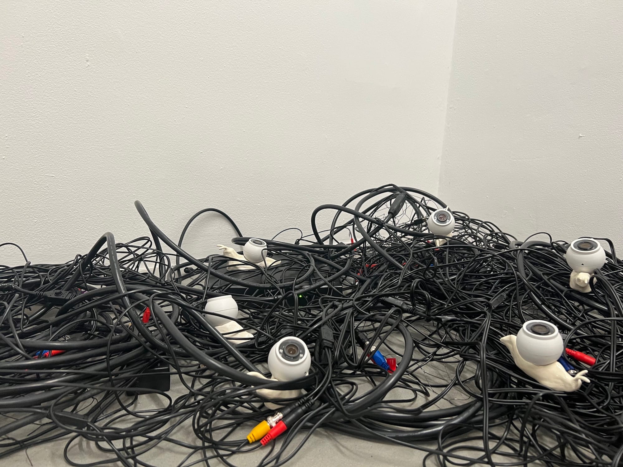 Installation view of Ruoxin Sun, "Snail, You Are on Camera" (2024), ceramics and CCTV cameras, dimensions variable