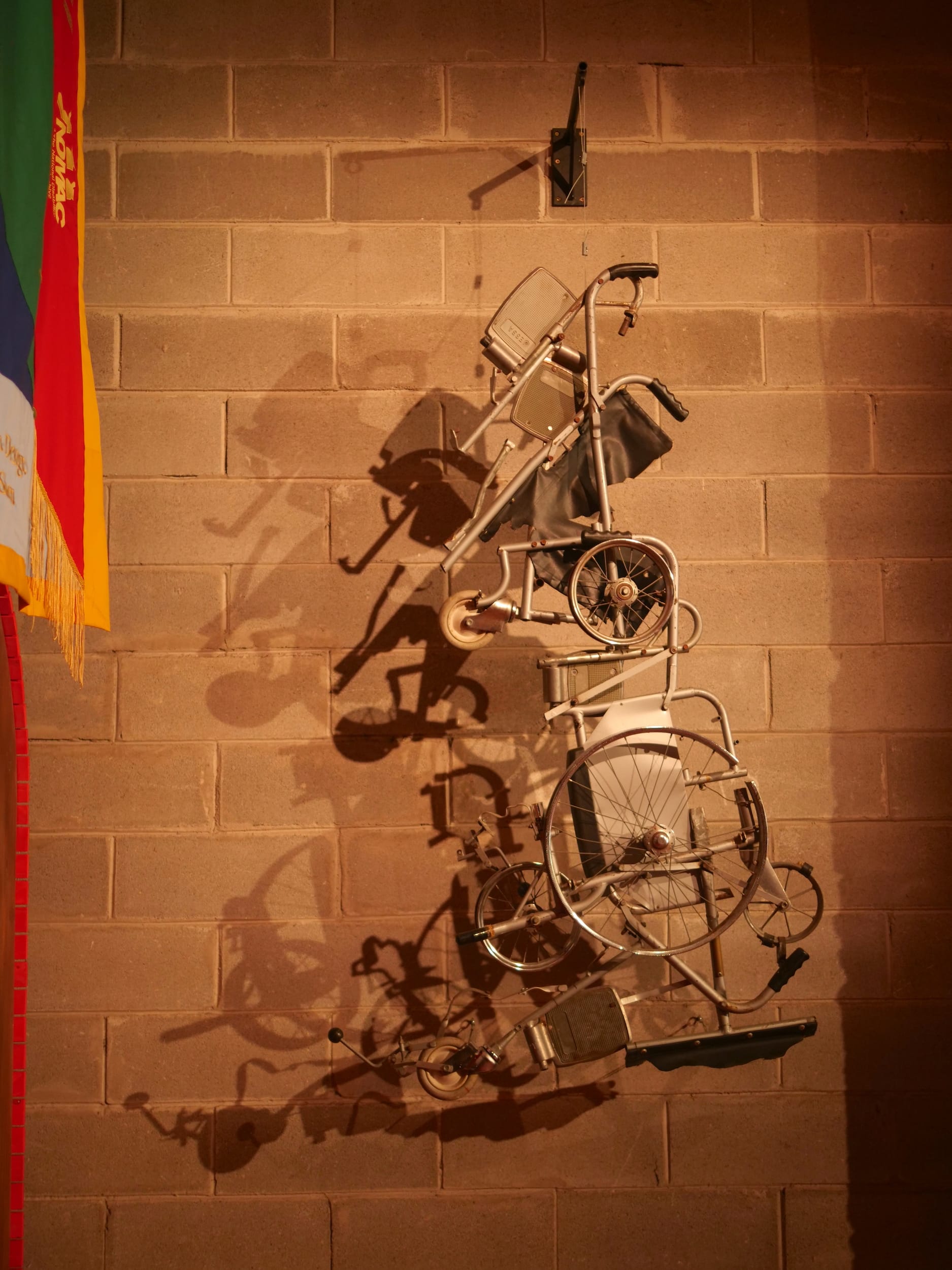 “Shaken Not Stirred” by Tony Heaton OBE steps away from the body entirely to look at the social context: a pyramid of red plastic donation cans. A few of them have a sticker reading “Rights for Disabled People Now!” The original work was part of the 1990s Block Telethon protests organized by DAM, which resisted a culture of charity and pity toward people with disabilities. In the original installation, Heaton smashed the pyramid with a prosthetic leg, but in the current show, the pyramid remains intact (for now).