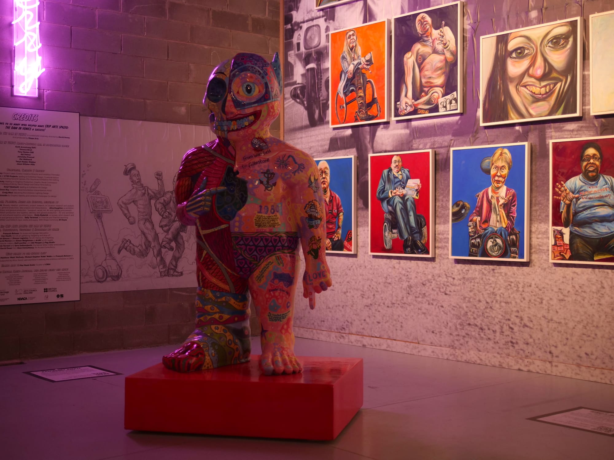Tanya Raabe-Webber’s Who’s Who Series captures major disabled activists affiliated with DAM. The paintings depict exaggerated facial features, while only some people have visible disabilities. And Raabe Webber’s “Self Portrait Triptych” shows the artist’s nude body composed of three separate paintings. “Webber’s body has all the same parts as a typical woman,” notes the exhibition text, “but perhaps combined in different ways.”