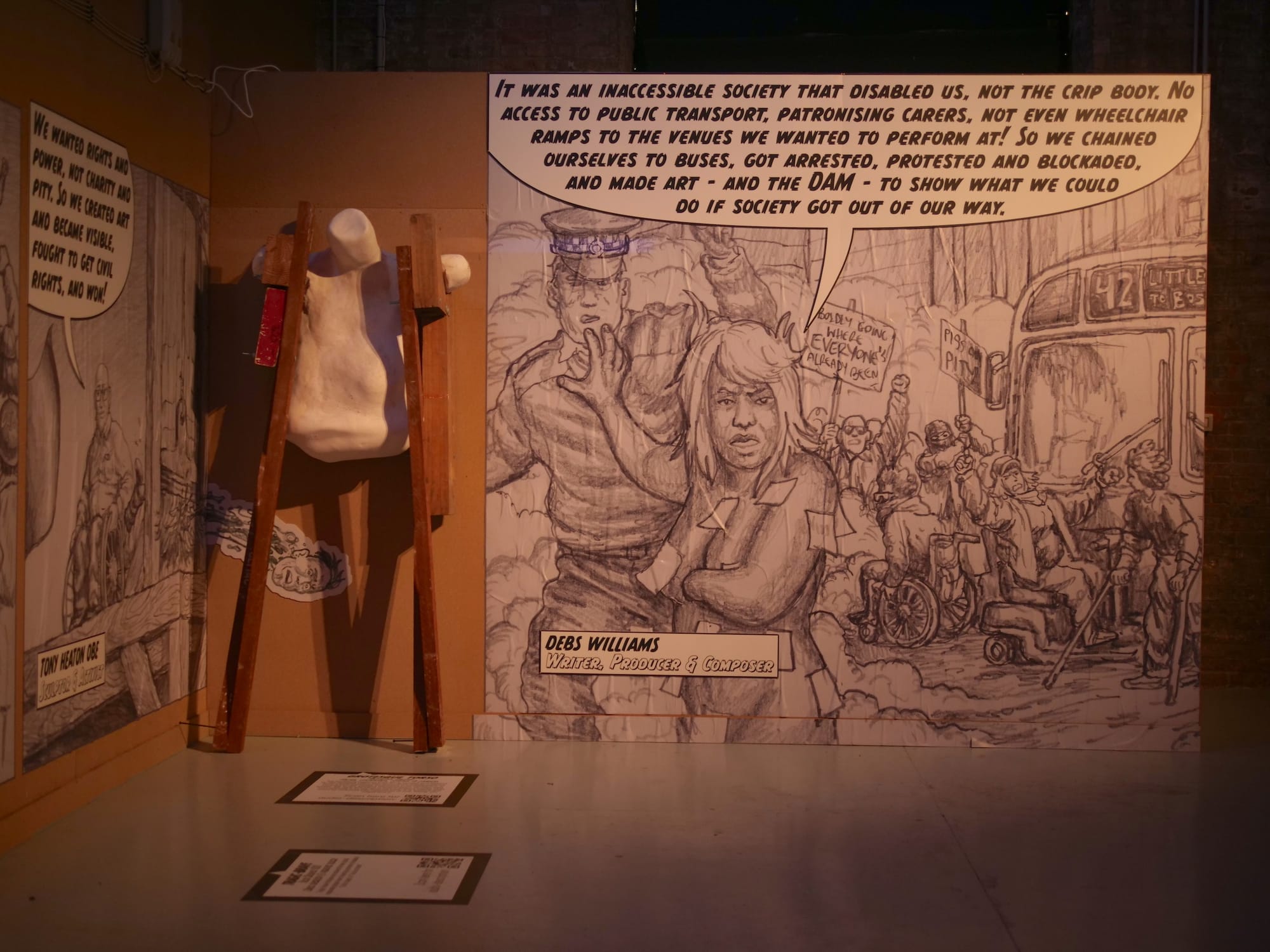Across the exhibition, graphic novel illustrations by Simon Roy guide viewers through some of the major themes in the show and important figures in the movement. At the entrance, for instance, comedian and activist Barbara Liscicki holds a bazooka while pointing out that DAM “fought barriers, changed the law, and made great art about their struggles!” In another scene, writer, producer, and composer Debs Williams pushes a police officer away during a direct action where activists chained themselves to buses: “It was an accessible society that disabled us, not the crip body.”