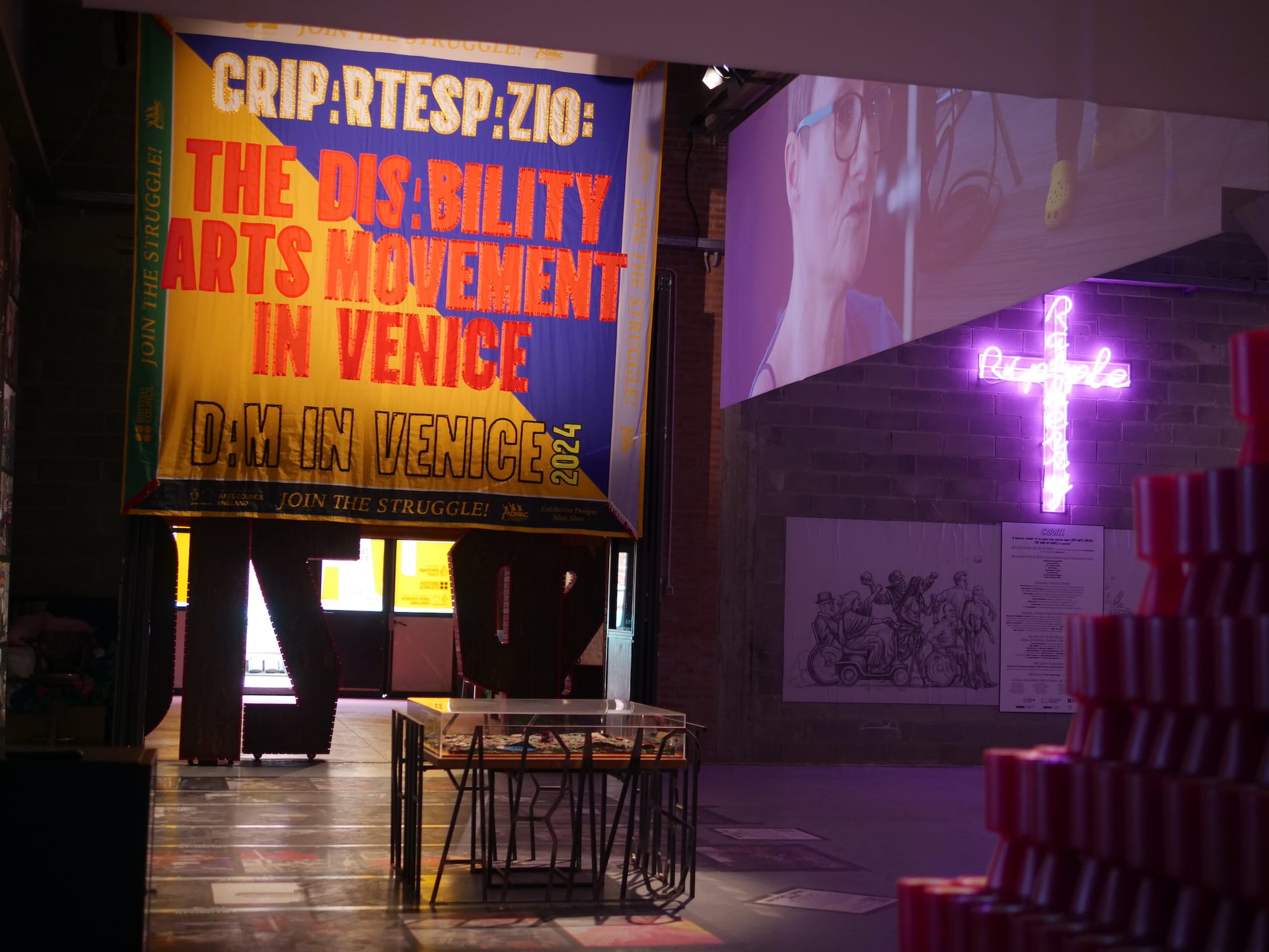 VENICE — The 60th Venice Biennale’s theme of “Foreigners Everywhere” includes a number of communities historically overlooked in art, like folks from queer, indigenous, and immigrant backgrounds. While disability does appear in specific works of art, it’s not a major presence. So I was pleased to learn about Crip Arte Spazio, an exhibition about the Disability Arts Movement (DAM), which started in the 1970s in the UK to advocate for the rights of disabled people, at CREA Cantieri del Contemporaneo in Giudecca.