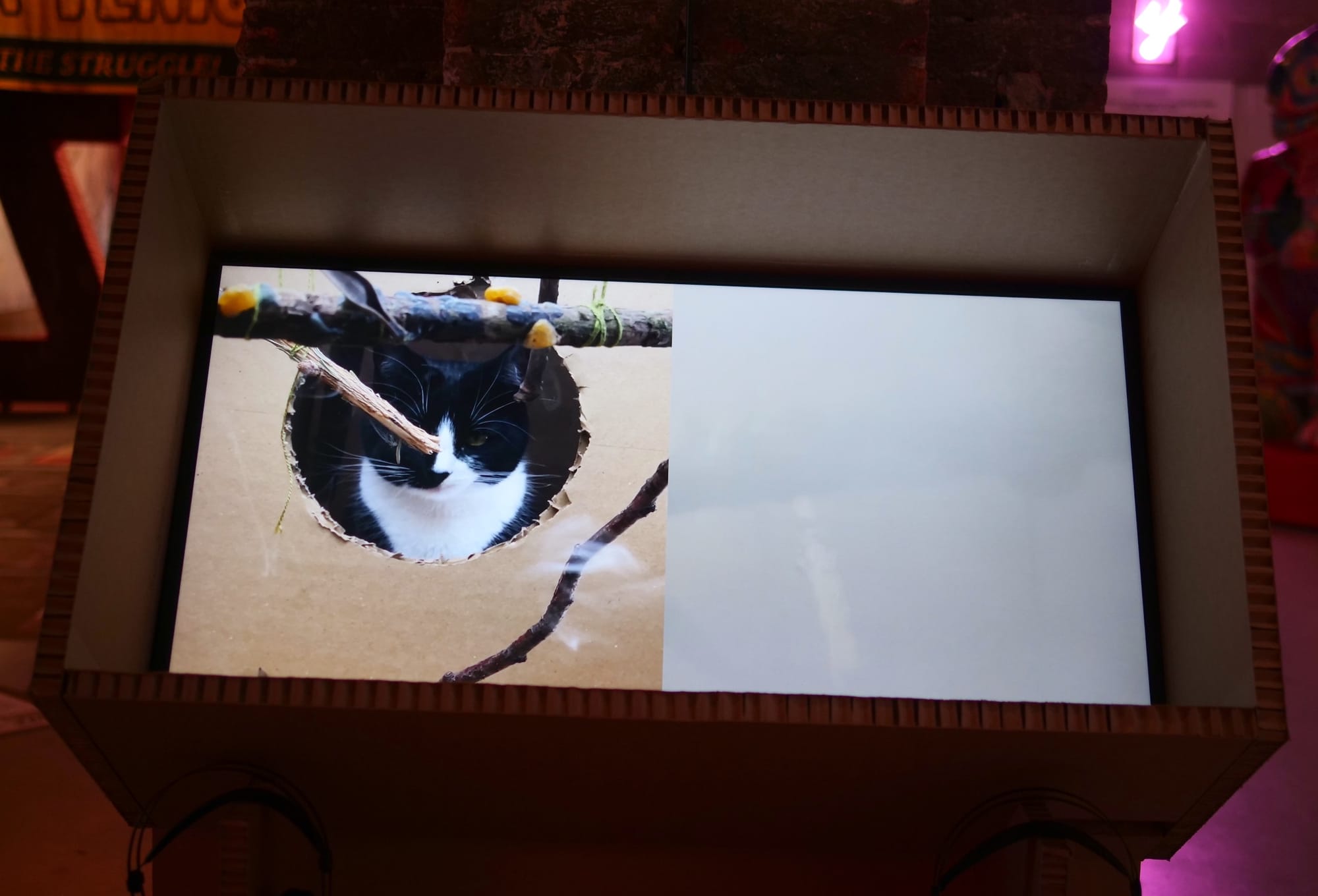 In “Abi Palmer Invents the Weather,” visitors peer into a video within a cardboard box. The video shows the artist creating environments for her cats during COVID lockdown so that they could both experience seasons. Charmingly, Palmer narrates the cats’ perspective. It’s a message that applies equally to a cat during COVID and to many navigating their way in an ableist world: “I felt safe in my den. No matter how strange and dark it gets in this deep, dense forest, others have passed before us…. It felt like I was protected. It felt like you are not alone.”
