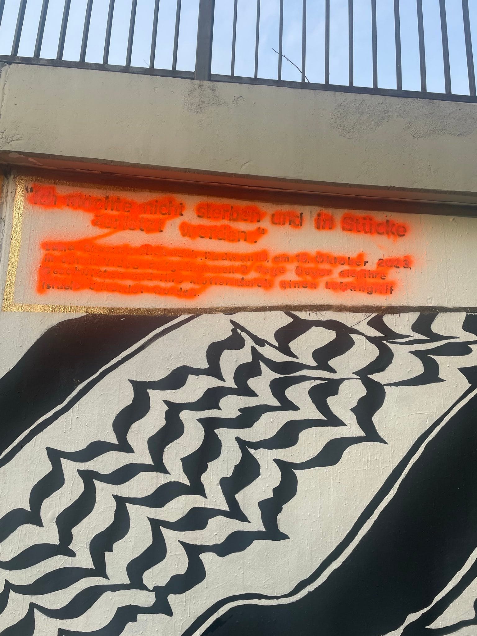Meanwhile, a protest camp was happening in front of the German Parliament. Artists and culture workers gathered to share their experiences of censorship. One of them was Athina Panagiotidou, a young muralist who is part of the collective Spray of Solidarity. They had just completed a mural in Cologne about Gaza that featured QR codes linked to atrocities from the last six months. The mural has been vandalized twice by the police.