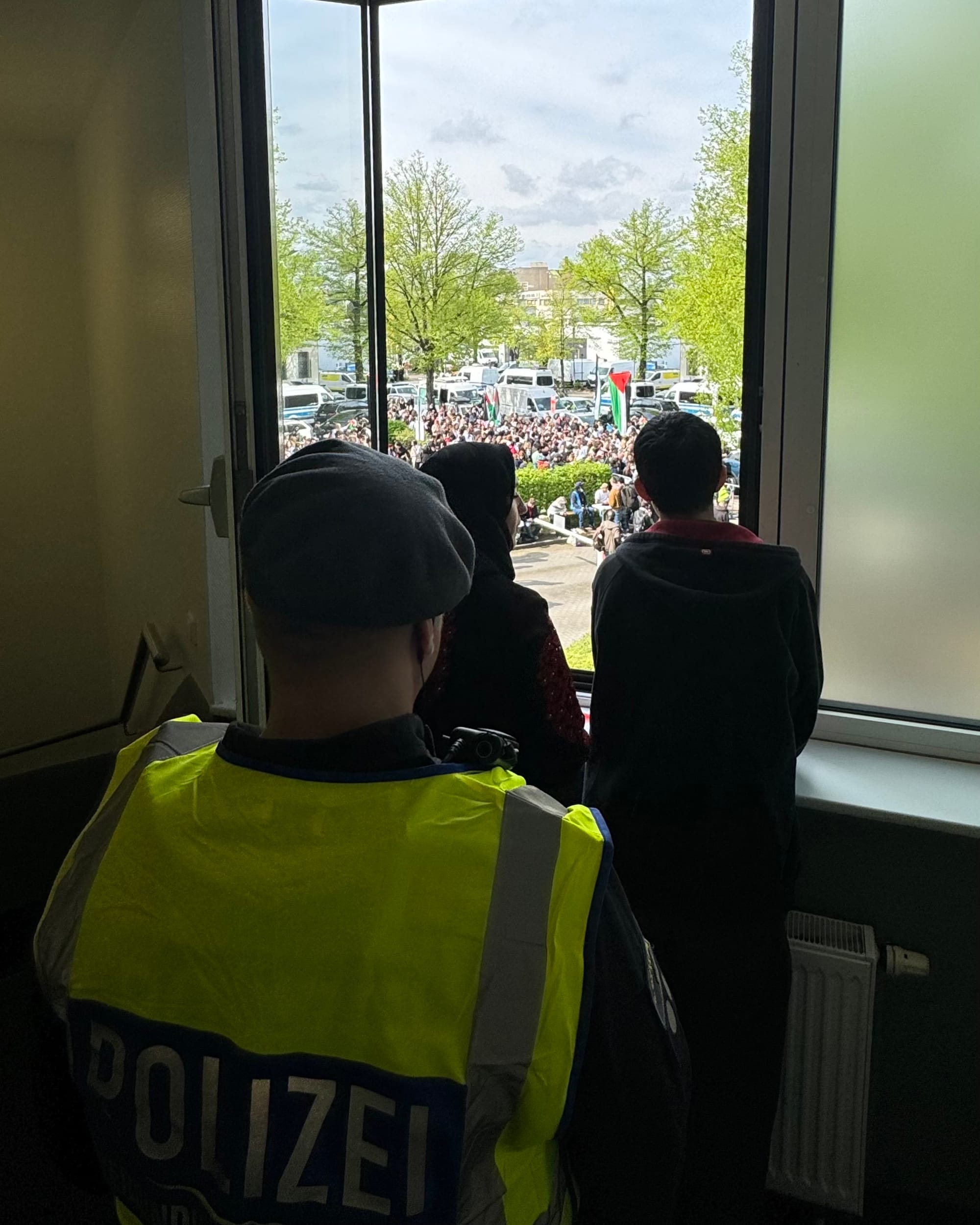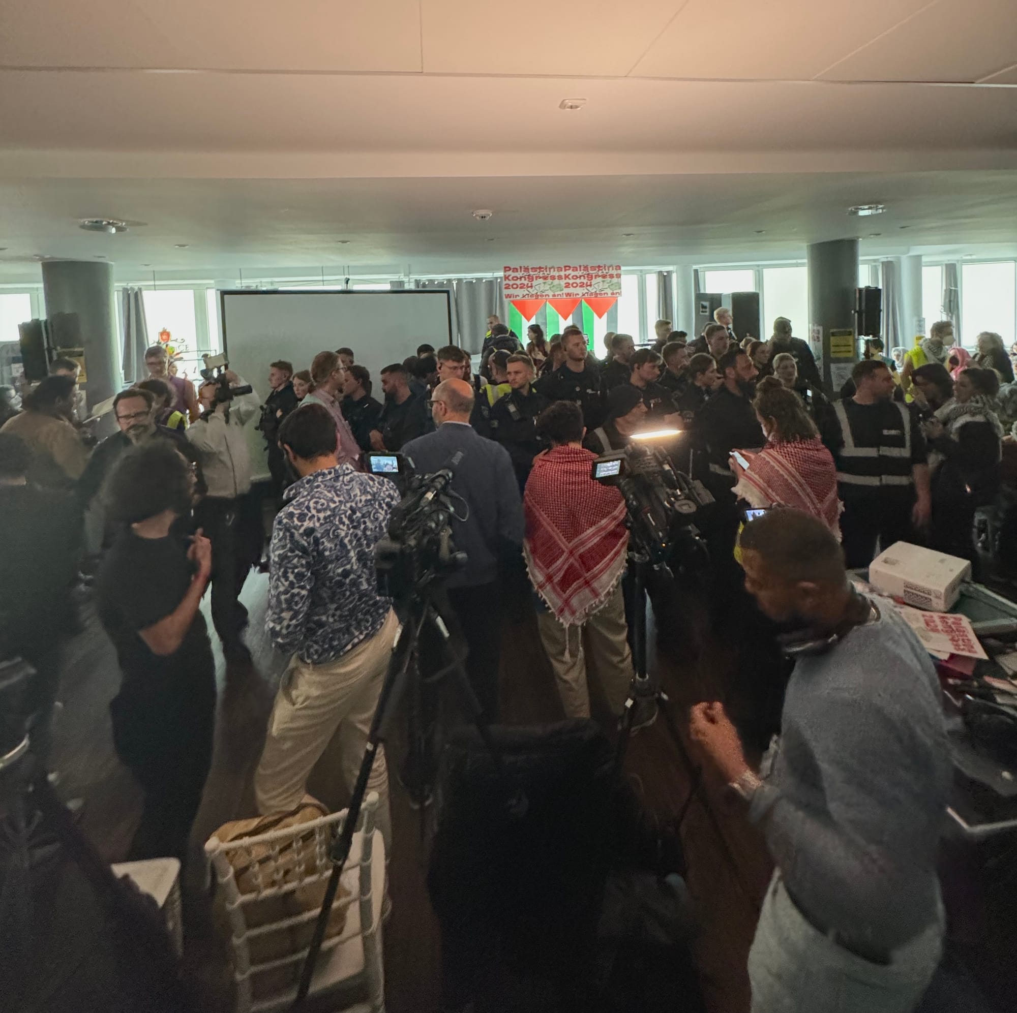 Participants weren’t given the location of the Congress until the morning of the event to protect it from getting shut down. The press conference on the first day of the Congress was like a scene from Law and Order. Upon arrival, we were met with barricades that looked like checkpoints. A pro-Palestine Jewish activist held up a banner that said “Jews against Genocide” and was immediately arrested. You would think the organizers would be the ones letting people in, but in this case, it was the Berlin police. Around 2,500 cops were called for the conference. Of the 1,000 attendees, almost none were initially allowed into the building. We found ourselves in a tense room with speakers, journalists, cops, and the few attendees who managed to sneak in.