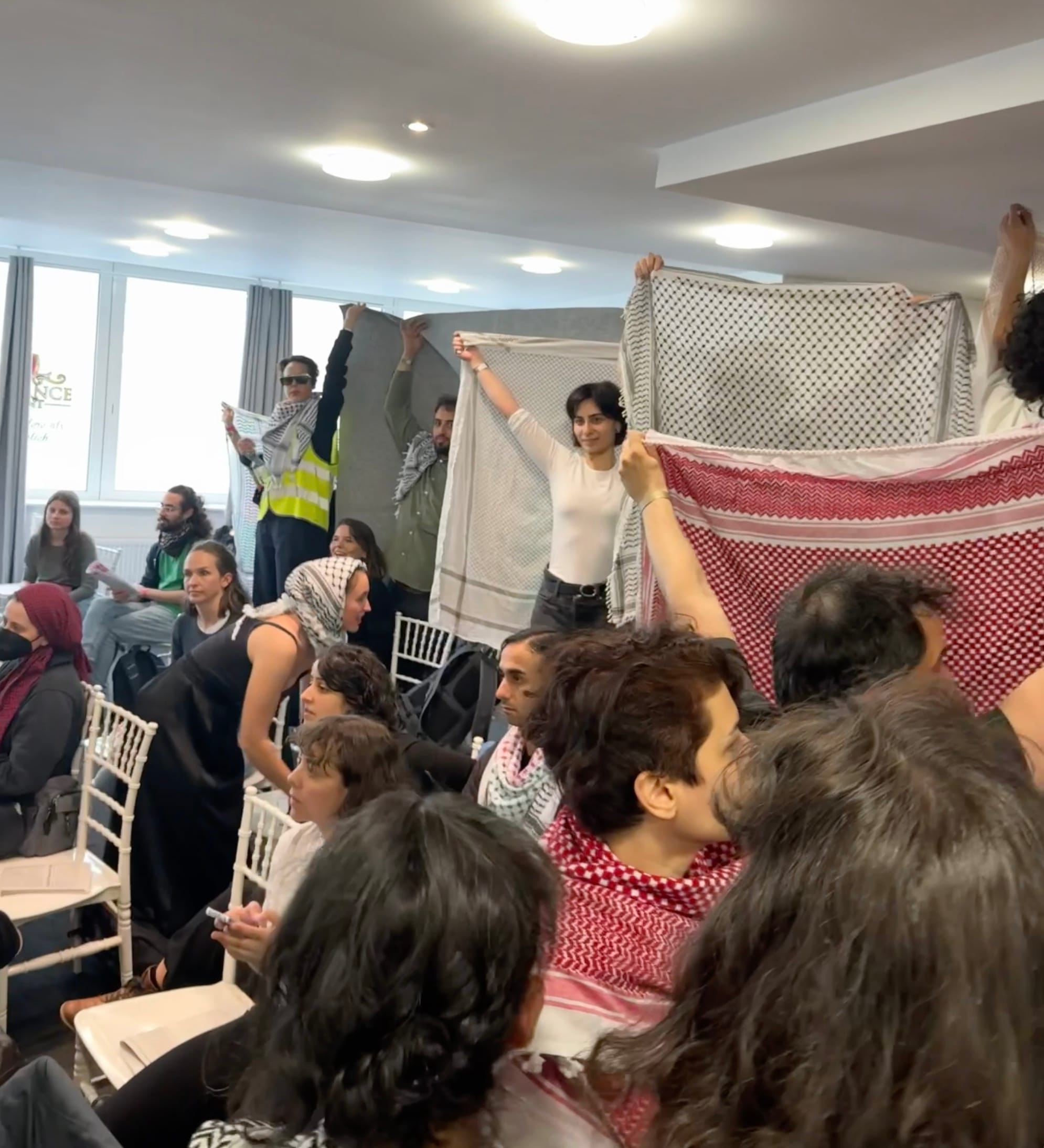 Before the conference began, baffled organizers cornered German media who had managed to sneak into the room and raised their keffiyehs in the air, forming a quilt to block the reporters’ view of the speakers — a performance piece in its own right. Marina Abramović could never.