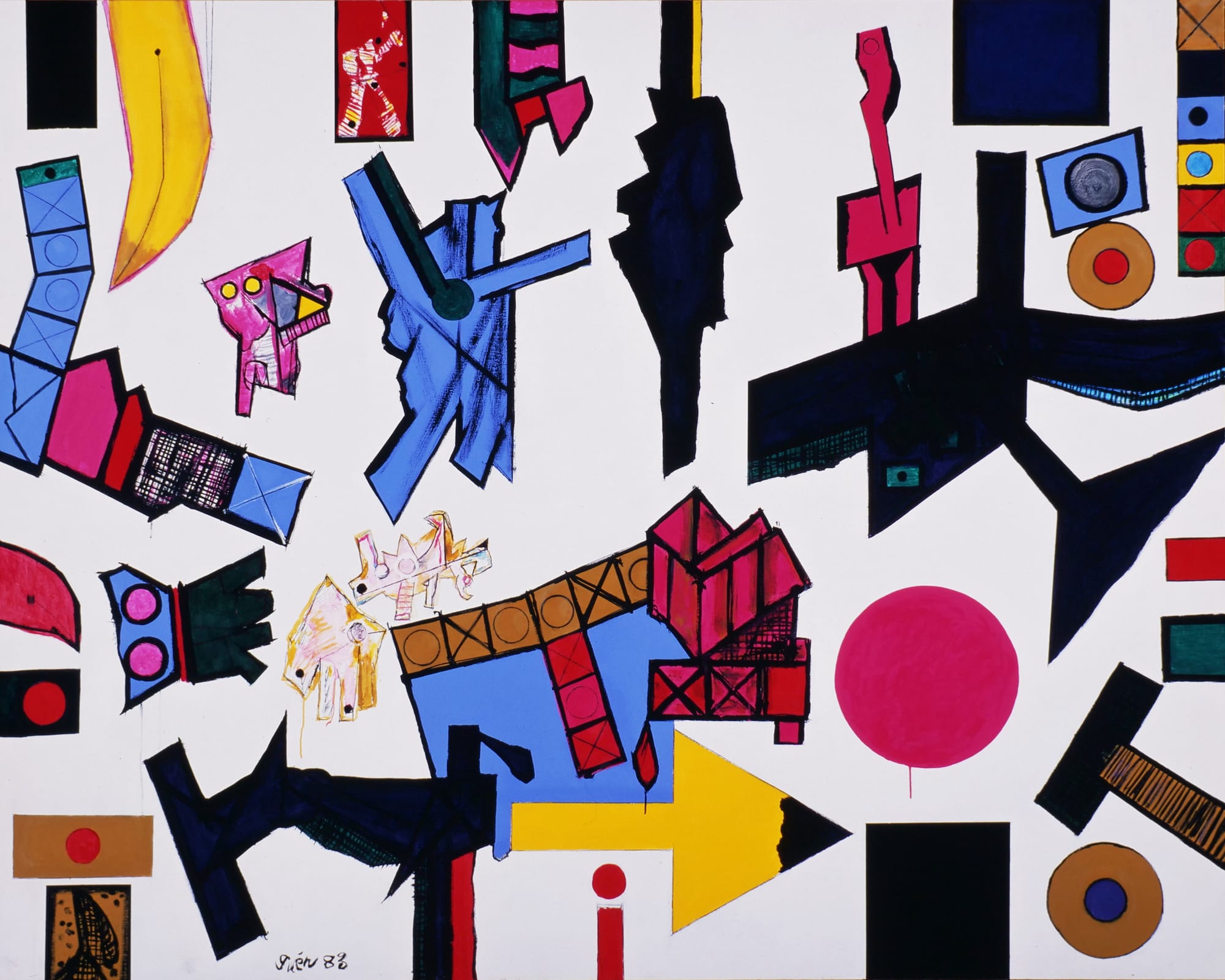 An avid follower of the moon landing, Inokuma was also captivated by the modern collision between technology and the universe. Hawaiʻi offered him clear, dark skies, and photos on view in the show depict a telescope stationed near his studio window. Stars, constellations, and robots appear repeatedly in the titles of his works, and in “Space is a Playground for Machines No. 2” (1981), angular red satellites float across a brilliant blue background. In this and other works, the edge of the canvas cuts off Inokuma's forms as if to suggest that they belong to a vast, cosmic field of space.
