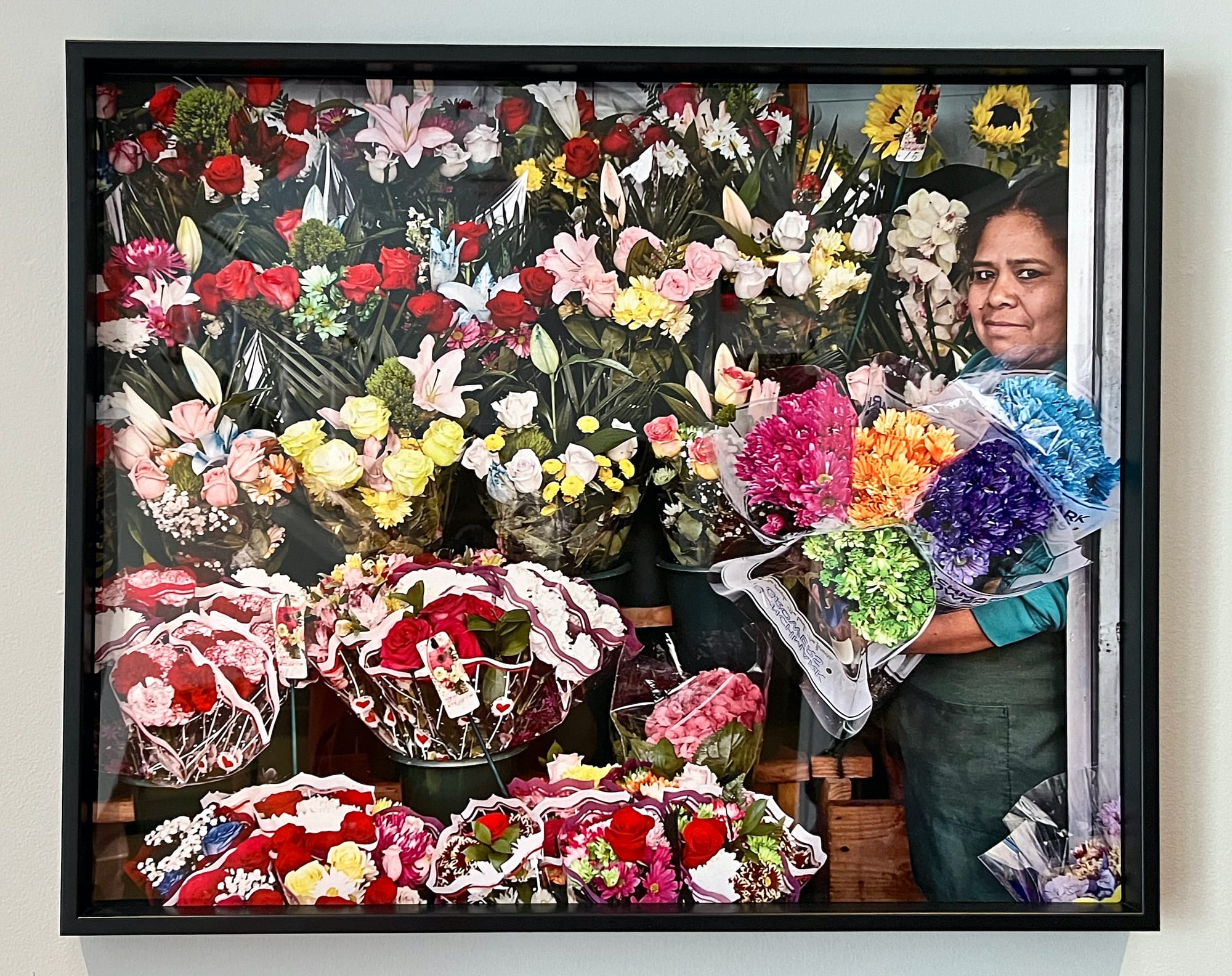 These photos highlight a bitter irony: The Bronx has the largest BIPOC population of the five boroughs, with a Latinx majority comprised primarily of Puerto Rican and Dominican immigrants and their descendants. As such, Bronx residents of color often carry deep ties to parts of the world where it's far easier to exit the built environment than it is in New York. In one of my favorite photos, "It All Comes Out in the Wash (Nykki)" (2019), we are inside a laundromat, its machines adorned in brightly colored floral motifs. The subject, Nykki, holds open a washing machine door, simultaneously posing and seemingly beckoning us into the machine. In another, a flower seller peers out from behind the sliding doors of her stall holding cellophane-wrapped bunches of carnations dyed in artificial shades of blue, purple, and green. And in a grouping of four photographs, those depicted adorn themselves in wigs, tattoos, flags, and a plastic octopus, each a synthetic representation of a “real” object, being, or concept. The photographs are not questioning who needs or wants to be around natural forms and greener areas (those are basic human needs), but rather asserting the competing needs, desires, and realities so many people have to juggle. Here we see adaptation, and a refusal to relinquish a relationship to nature.