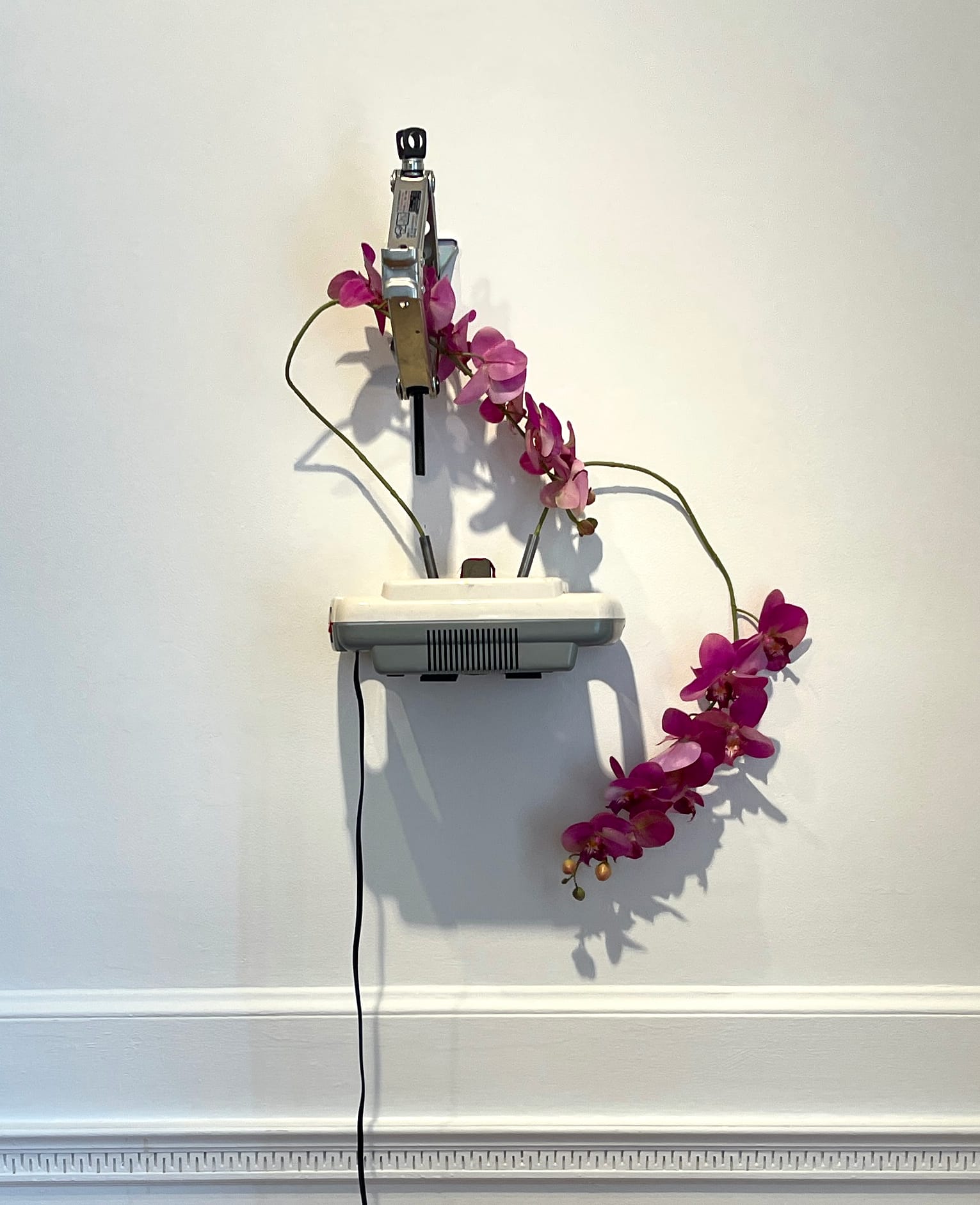 Rachel Youn’s kinetic sculptures address some of the same themes as Ruben Natal-San Miguel’s work, but with a much drier sense of humor. Plastic flowers jostle and bump awkwardly against one another, moving at the behest of deconstructed machines, such as the "masseur" a portable massage tool produced for consumers in the 1990s. The false intimacy, mechanical stimulation, and simulated nature of the plastic flowers call up so much, from the city’s ubiquitous street-level massage parlors to the repetitive monotony of dating apps, the popularization of “self-care” over collective care, and the existential isolation brought on by paltry imitations of desired human contact. Within the context of this show, Youn's sculptures seem to cast doubt on the question of the natural by teasing us with hints of just how much effort, money, and petroleum we use up creating or experiencing artificial realities.