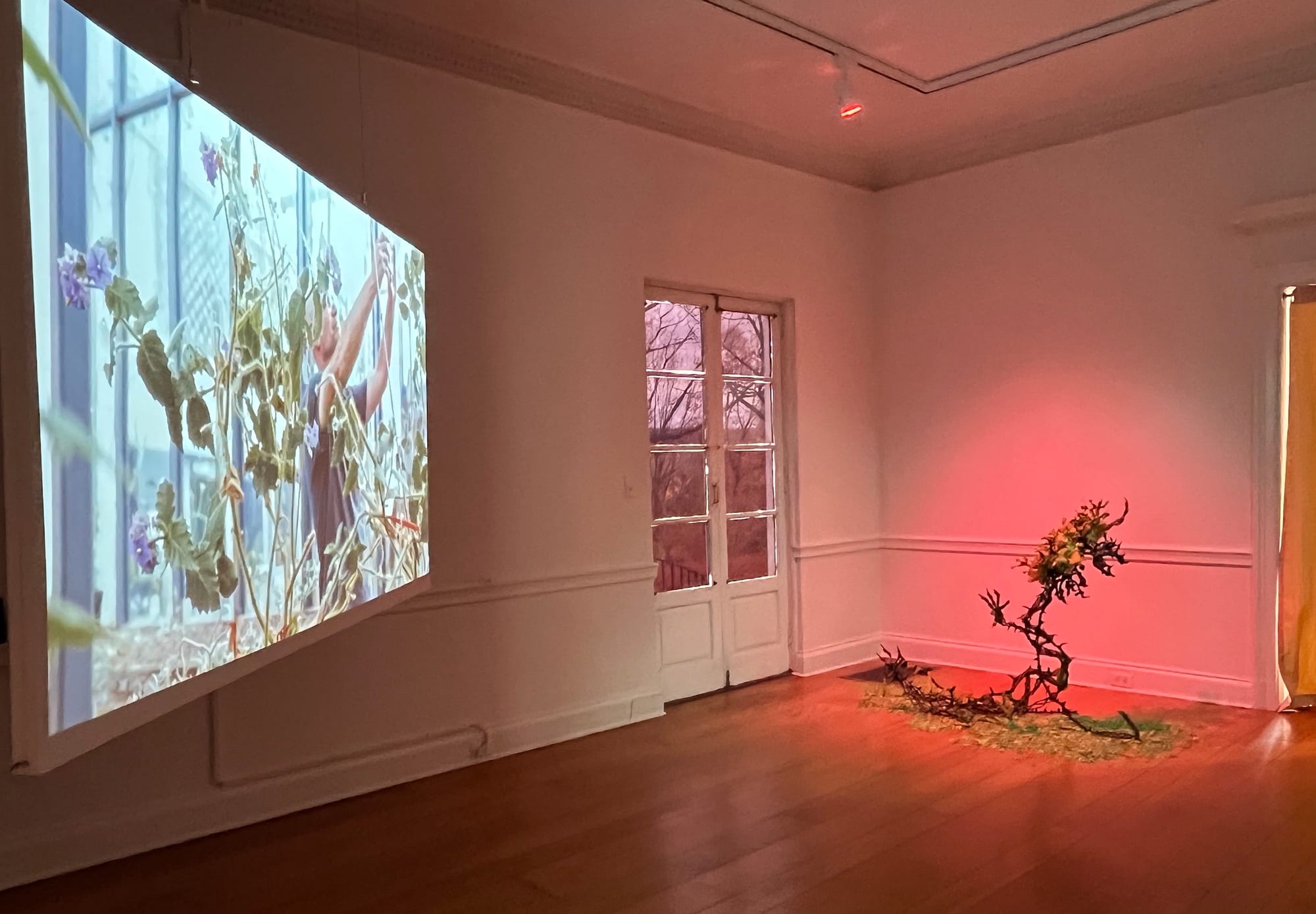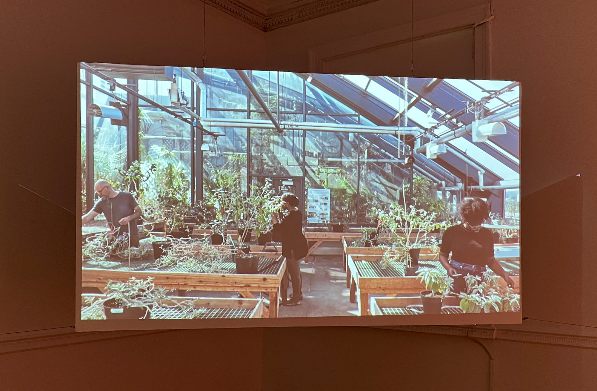 Perfect Trouble: Queering Natureculture feels more mixed overall, but the context and the curators' questions pull the experience together. In Erin Johnson’s video piece, “There are things in this world that are yet to be named” (2020), a group of botanists from the Huntington Botanical Gardens in San Marino, California, study a rare Australian bush tomato species (solanum plastisexum), a plant that defies easy categorization because it lacks a stable or singular sexual expression. As the camera moves through the garden spaces (similar to parts of Wave Hill), we see scientists attempting to understand something that counters current categories of plant biology. The video's narration includes excerpts from letters written by author Rachel Carson (who famously rang the alarm bells for environmental devastation with her 1962 book Silent Spring) to her lover, Dorothy Freeman. The letters are filled with longing, to feel both connected and understood.